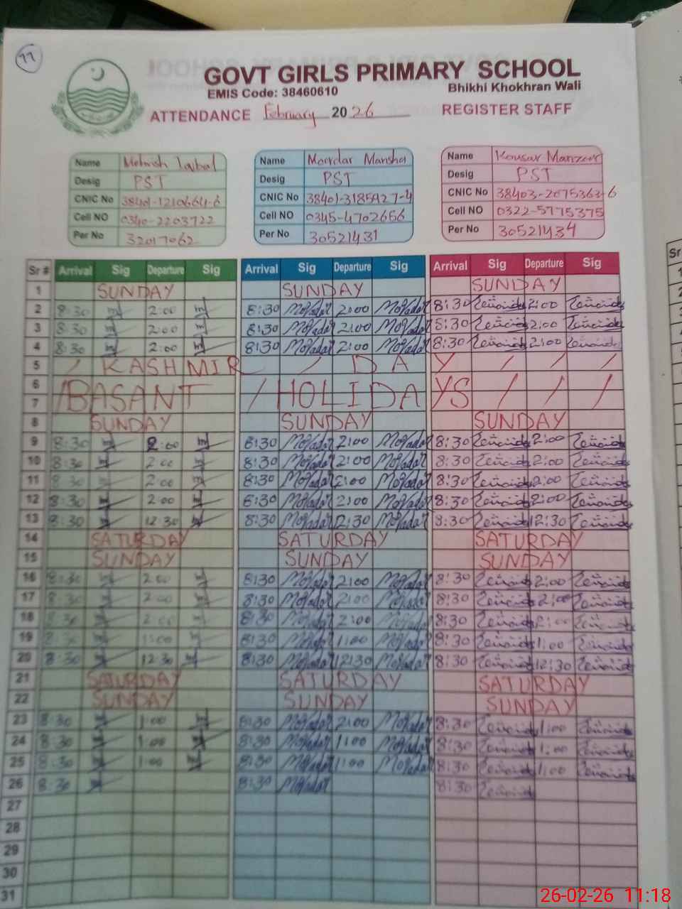 | CNIC | Full Name | Designation | R/C | Absence During Last Calender Month |