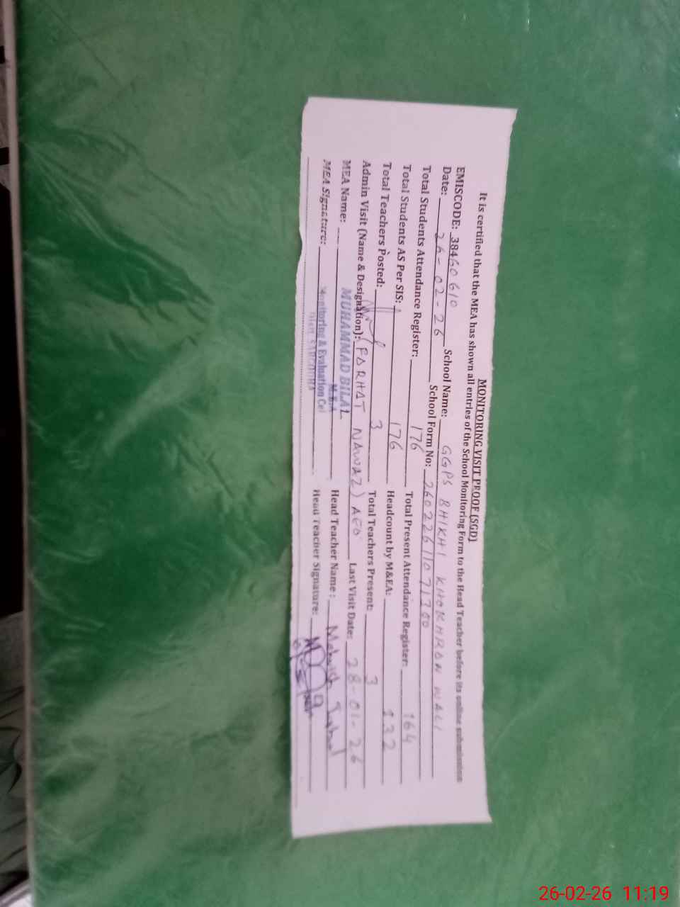 | Attendance Register | Head Teacher | MEA with School | Visit Proof |