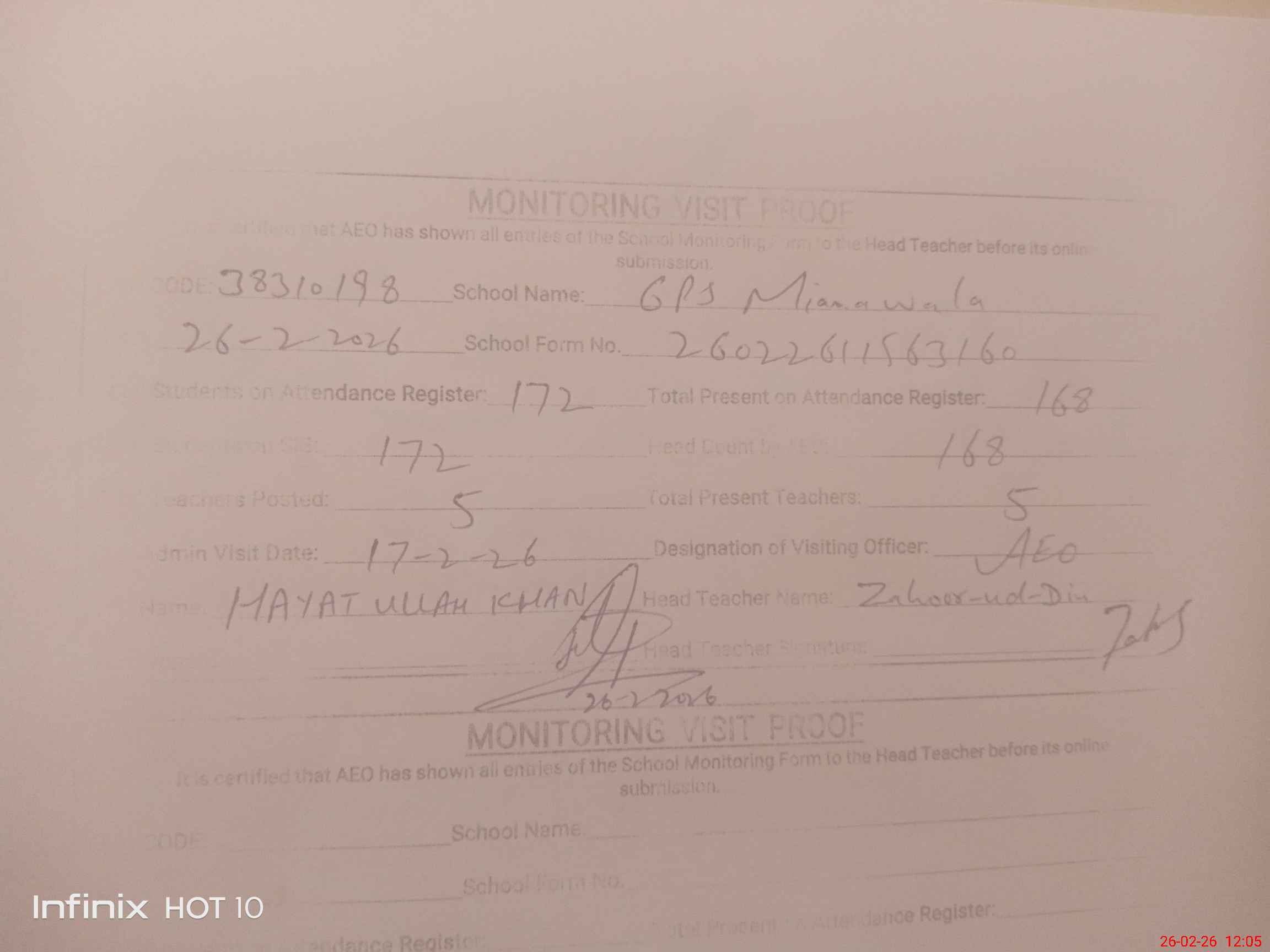 | Monitoring Date: 26-02-2026 | Start Time: 26-02-2026 11:35 AM | End Time: 26-02-2026 12:05 PM | Name of MEA: Ha**** Ul**** Kh**** | |