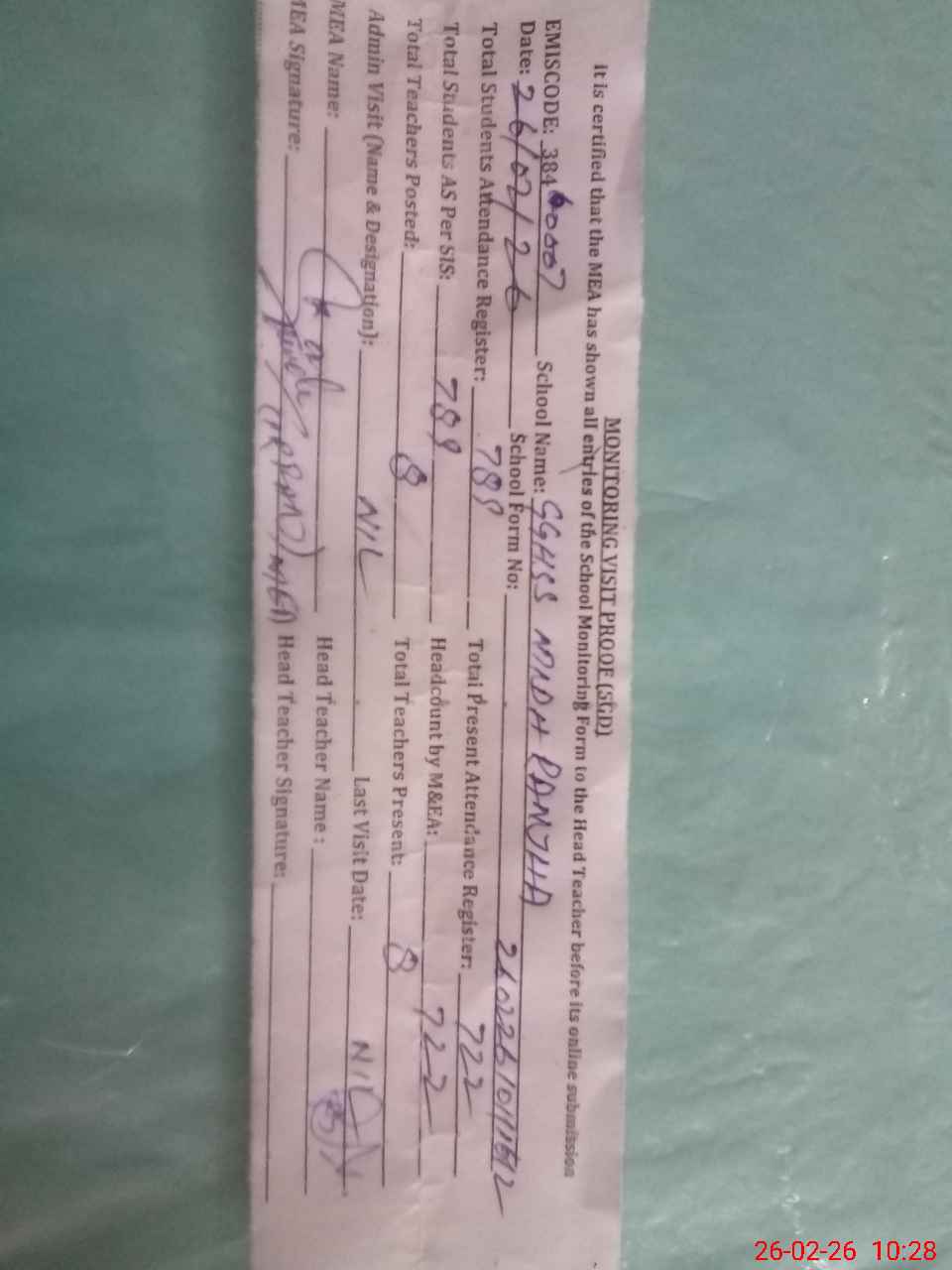 | Attendance Register | Head Teacher | MEA with School | Visit Proof |