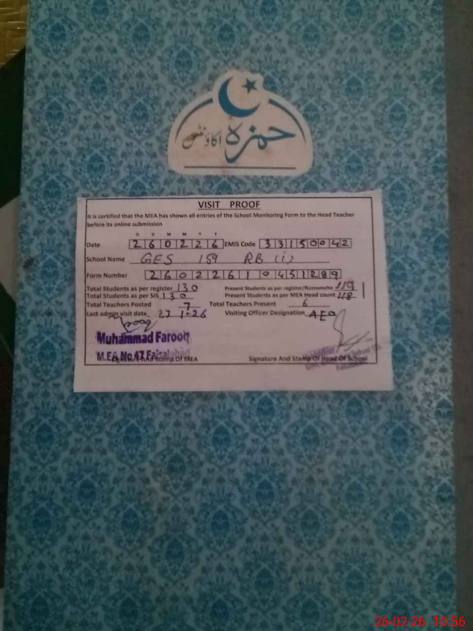 | Attendance Register | Head Teacher | MEA with School | Visit Proof |