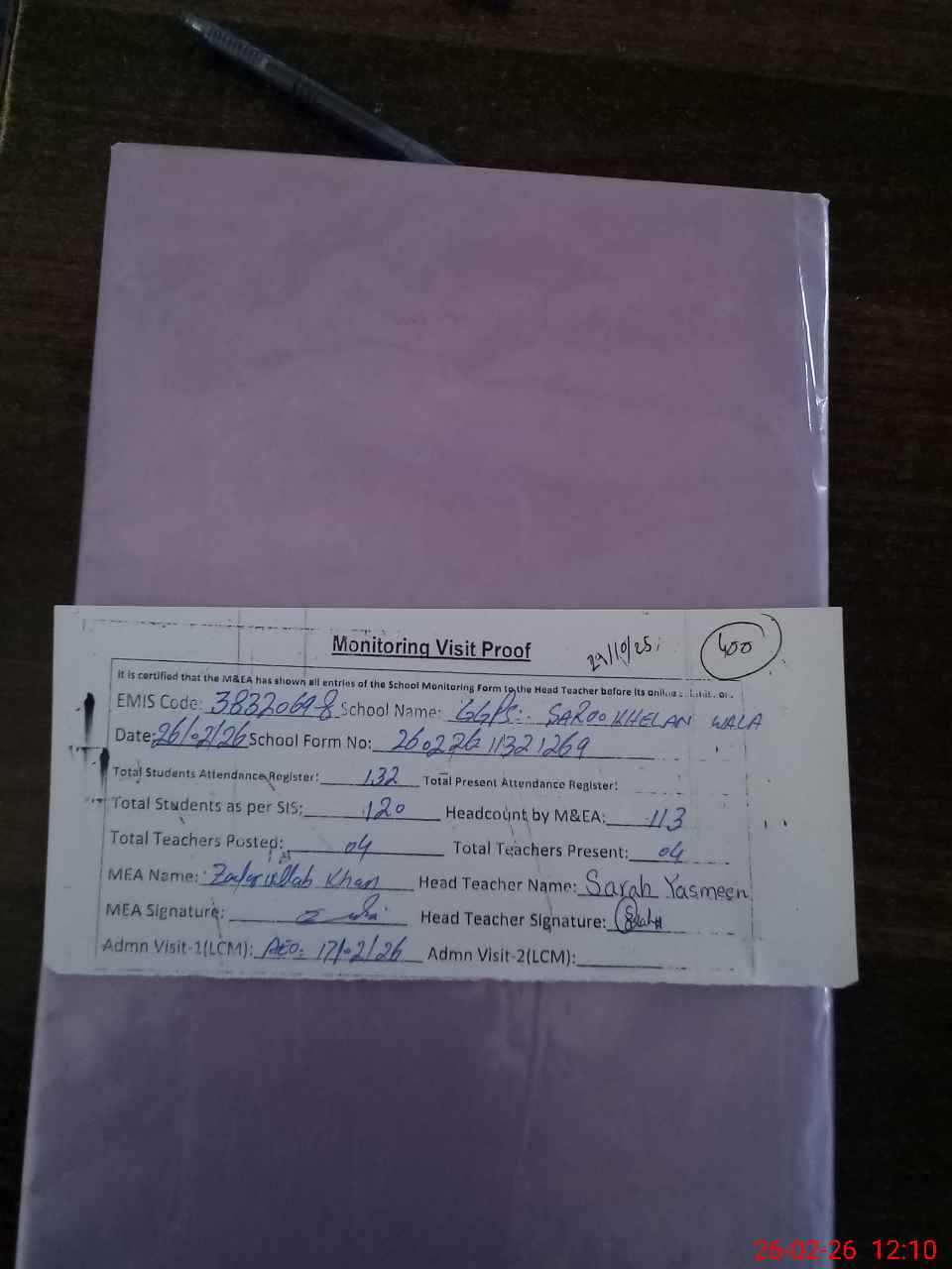 | Attendance Register | Head Teacher | MEA with School | Visit Proof |