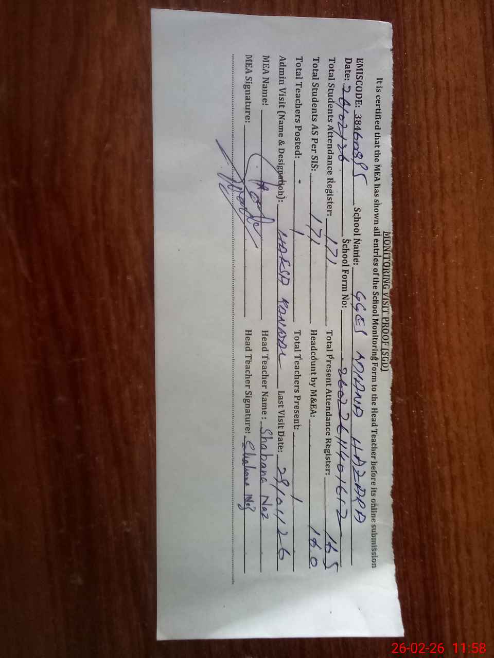 | Attendance Register | Head Teacher | MEA with School | Visit Proof |