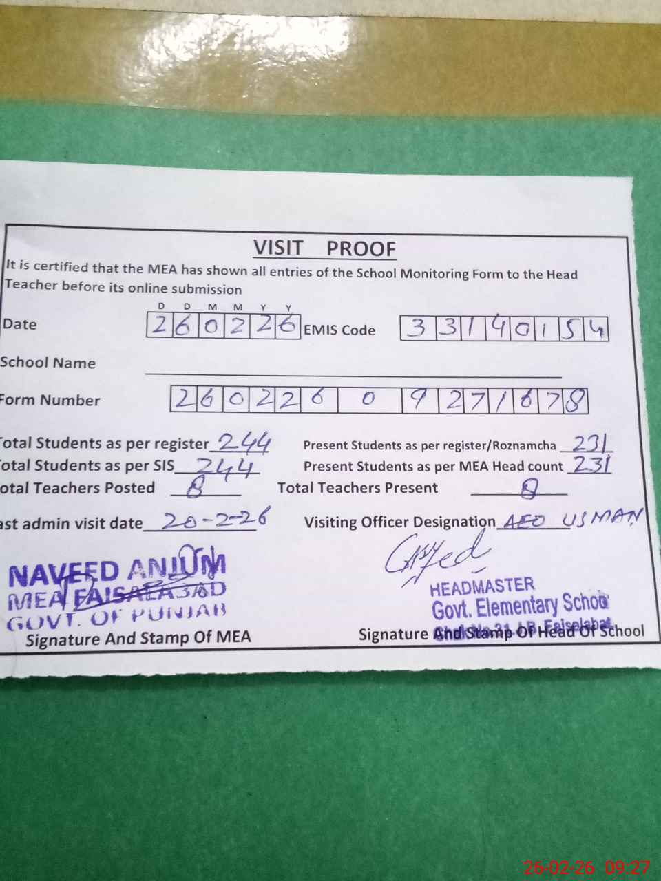 | Attendance Register | Head Teacher | MEA with School | Visit Proof |