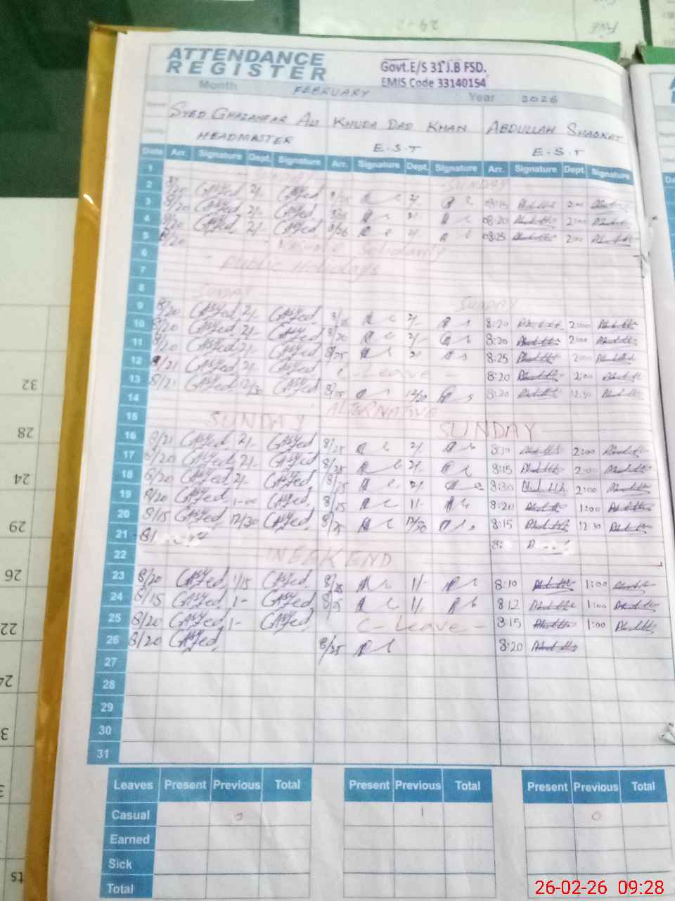 | CNIC | Full Name | Designation | R/C | Absence During Last Calender Month |