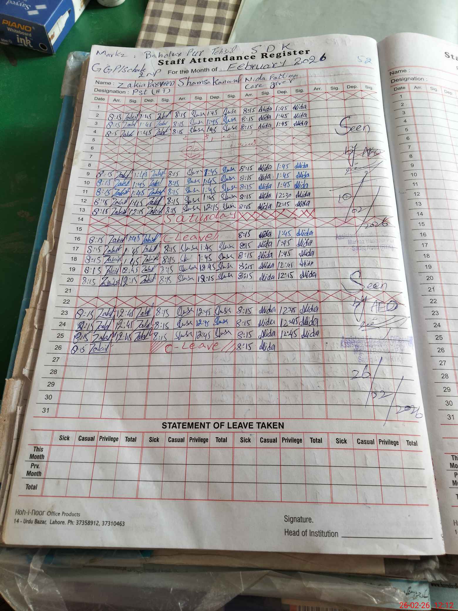| Leave | Duty | Absent | Maternity | Medical | Ex- Pak |