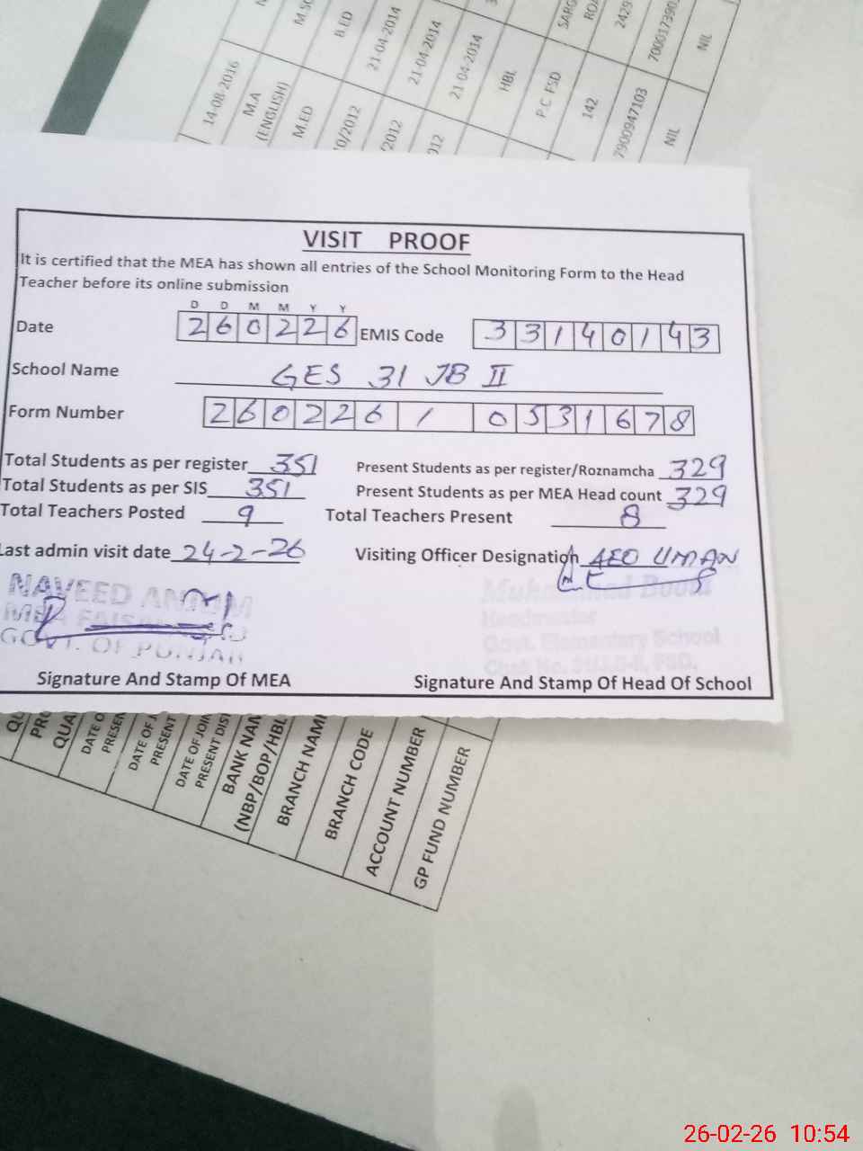 | EMIS Code: 33140143 | Name of School: GES CHAK NO. 31 JB II | |||