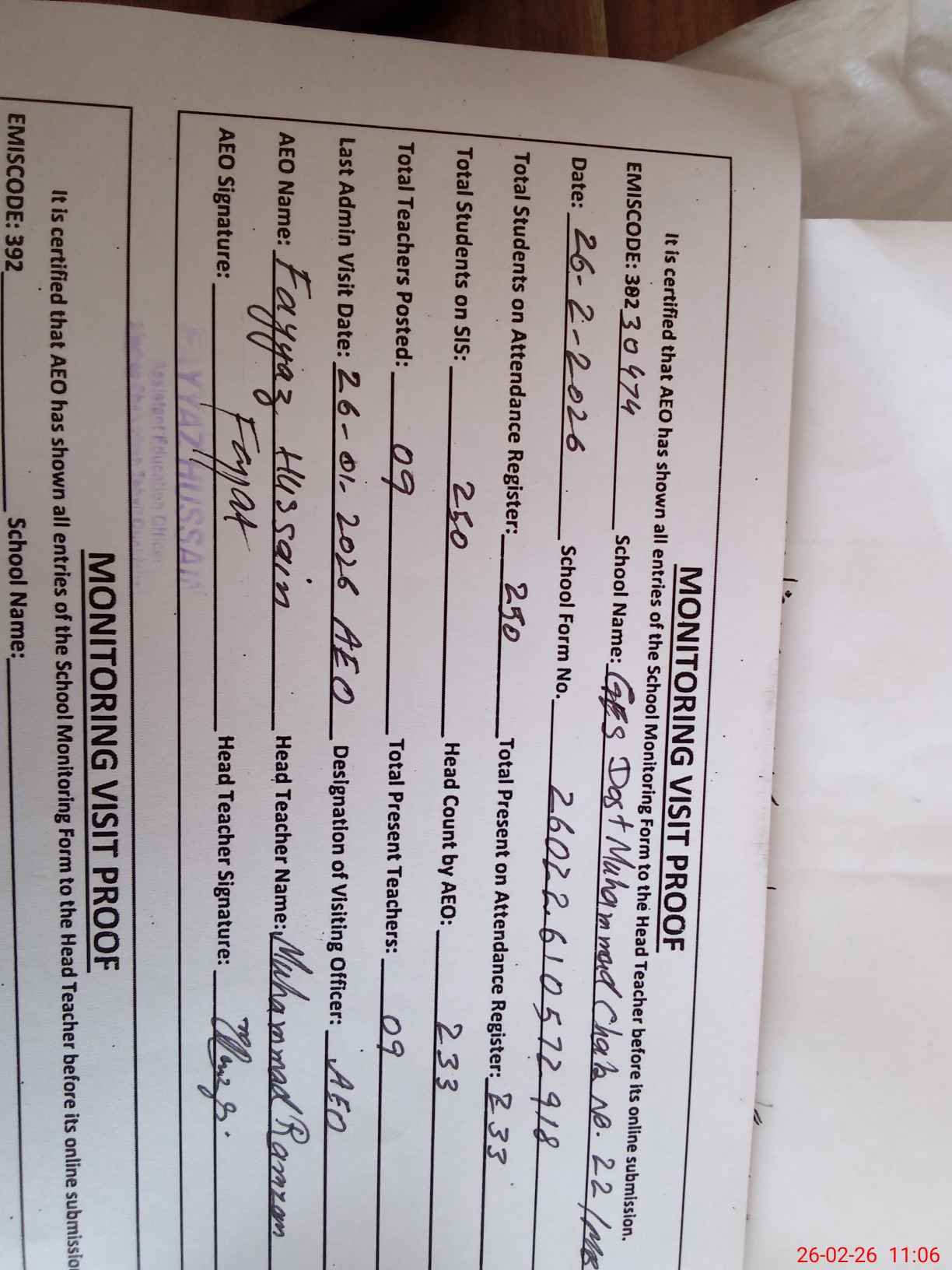 | Certified that this School was Inspected by the Undersigned MEA/DMO Today and the Information Stated Above is as Per Record. | |||||