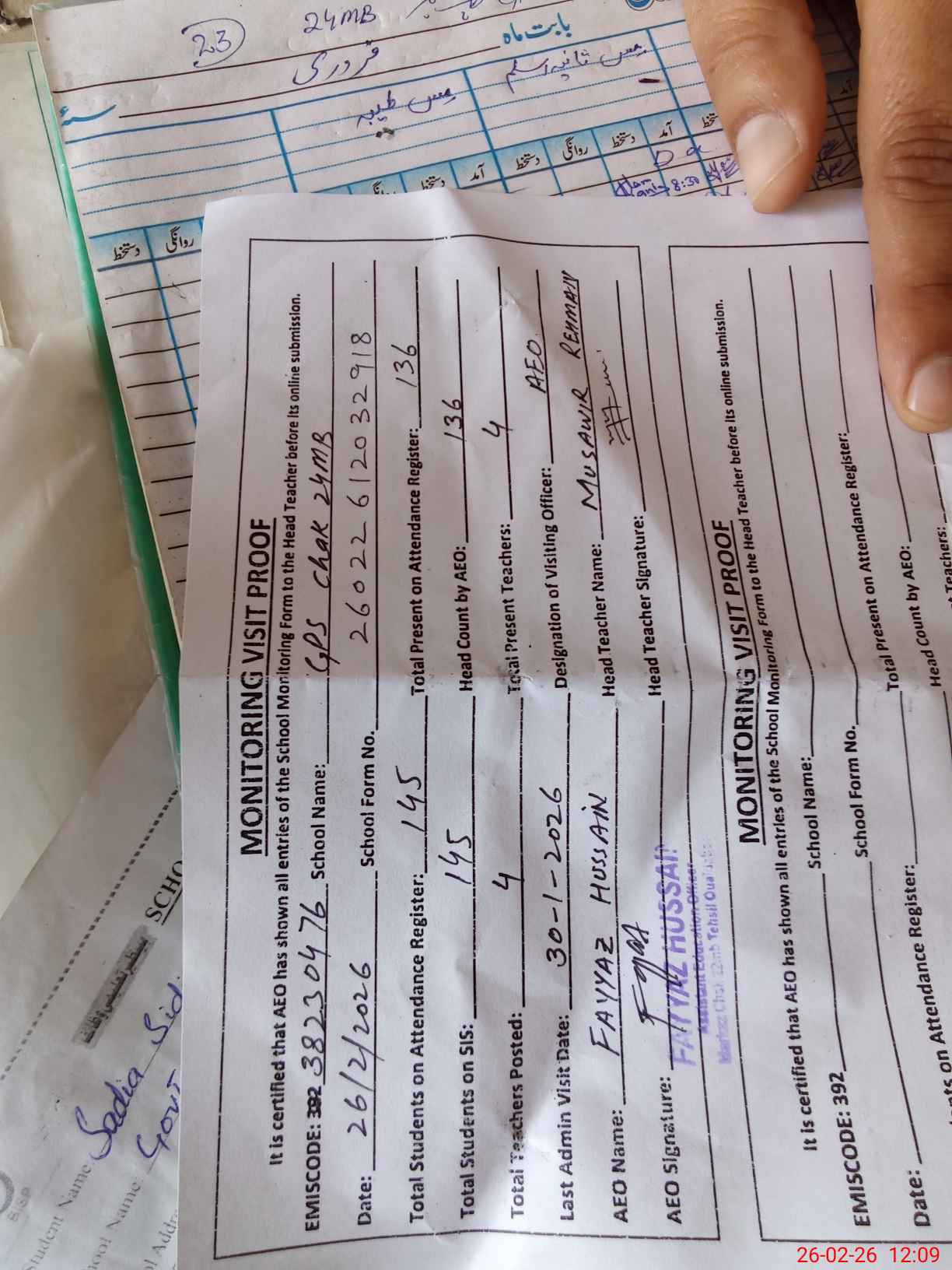 | Attendance Register | Head Teacher | MEA with School | Visit Proof |