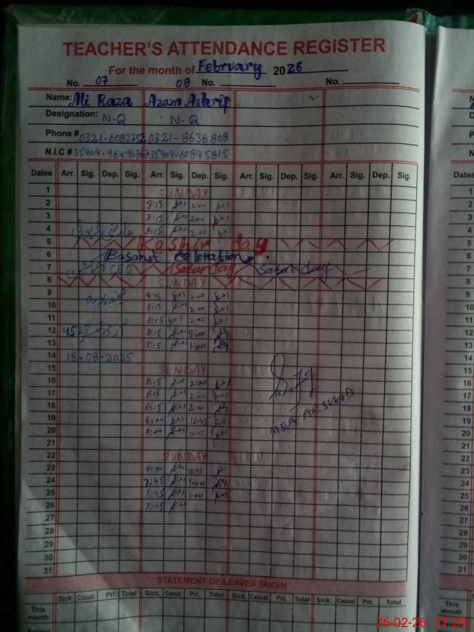 | Name: NA**** AK**** Designation: (School Headmaster's/Headmistress's) PST Phone/Cell Number: 03**** |