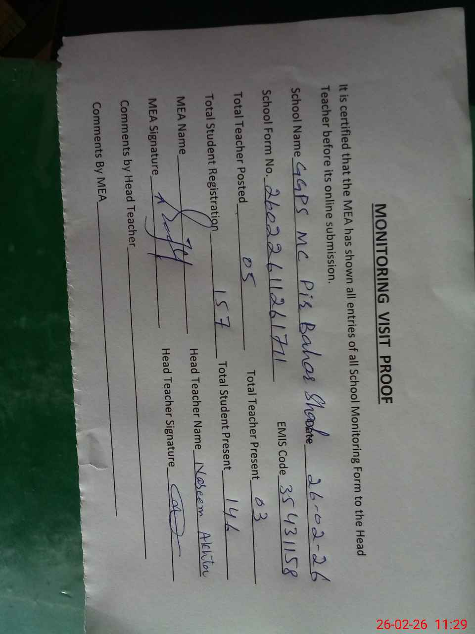 | Attendance Register | Head Teacher | MEA with School | Visit Proof |