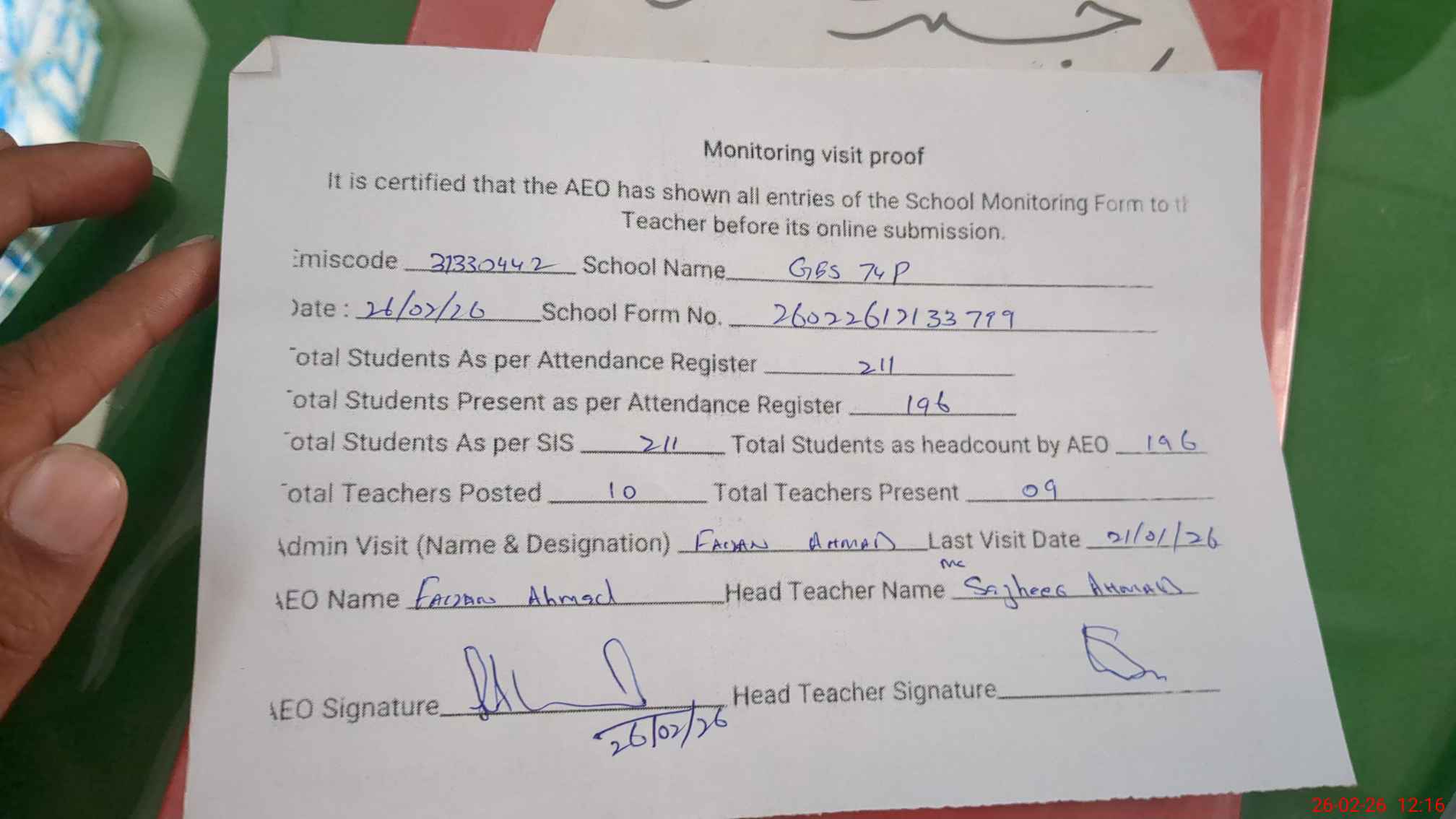 | Attendance Register | Head Teacher | MEA with School | Visit Proof |