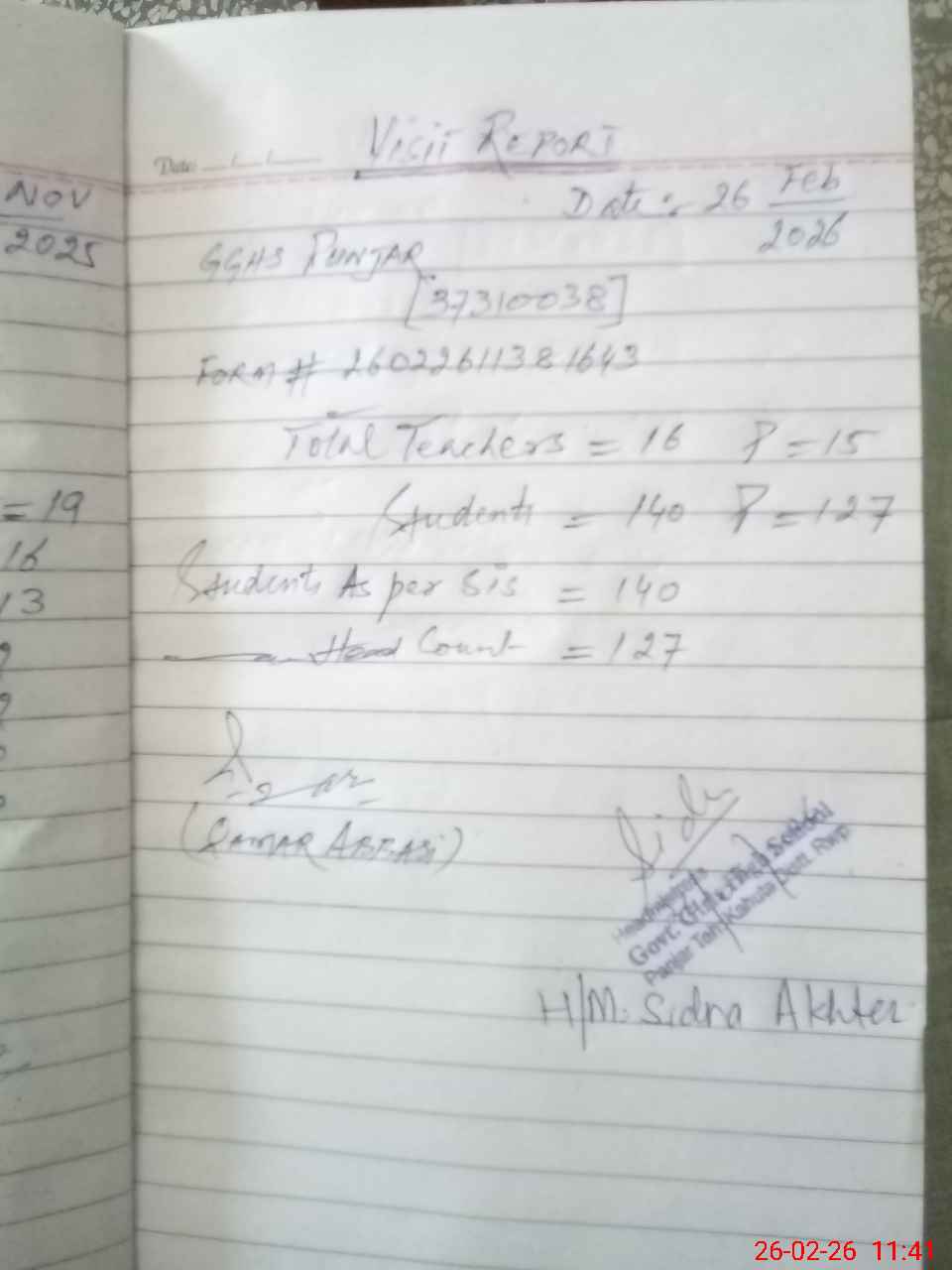 | Attendance Register | Head Teacher | MEA with School | Visit Proof |
