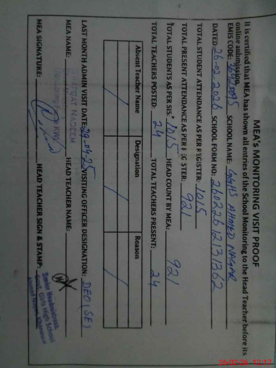 | EMIS Code: 36420095 | Name of School: GGHS AHMAD NAGAR, KHANEWAL | |||