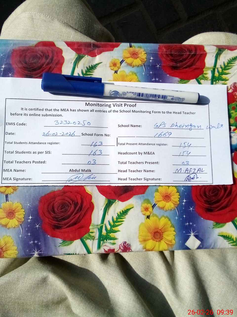 | Attendance Register | Head Teacher | MEA with School | Visit Proof |
