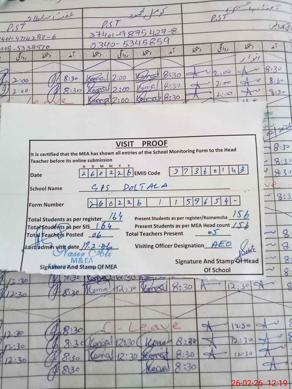 | Attendance Register | Head Teacher | MEA with School | Visit Proof |