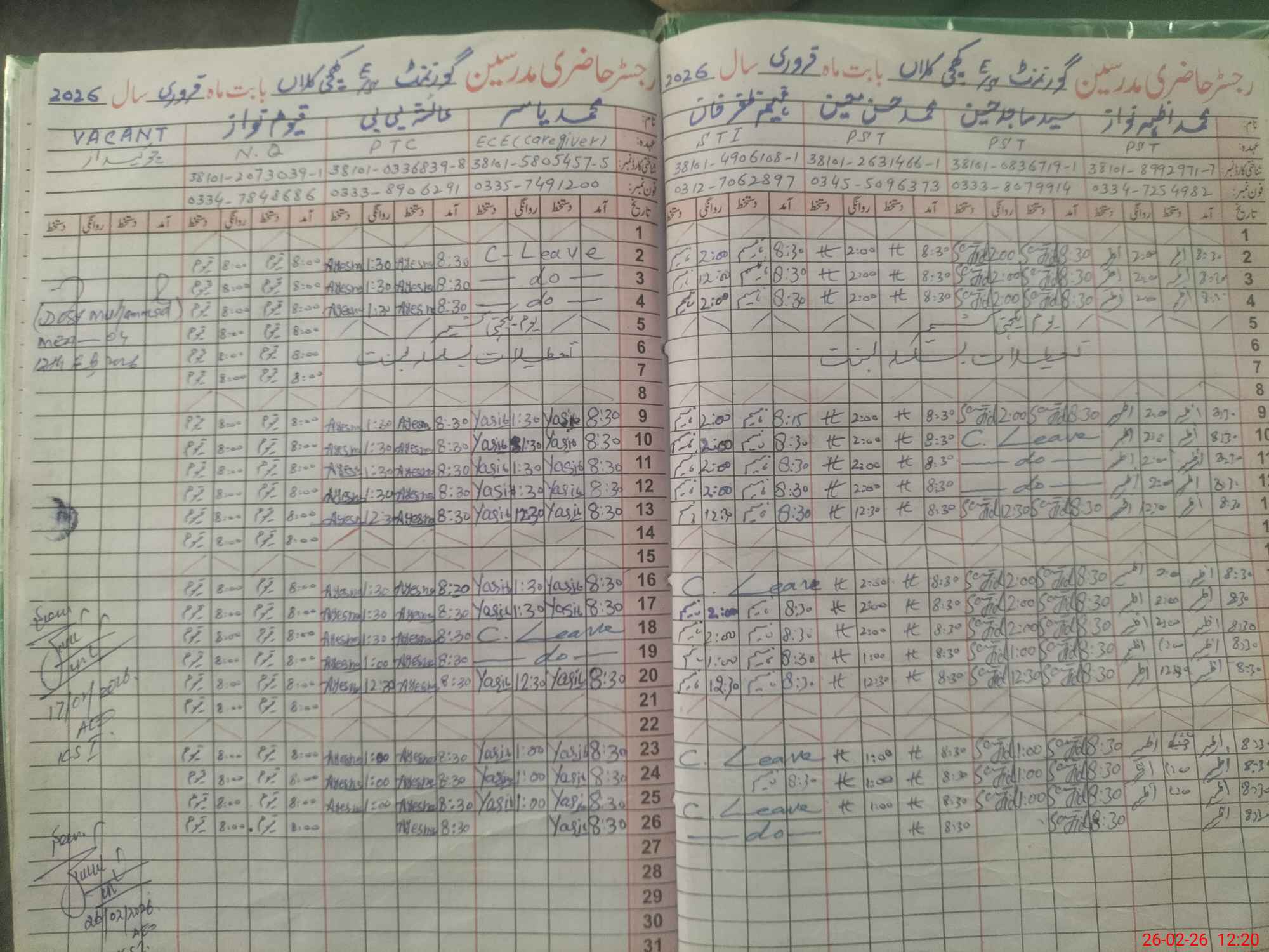 | CNIC | Full Name | Designation | R/C | Absence During Last Calender Month |