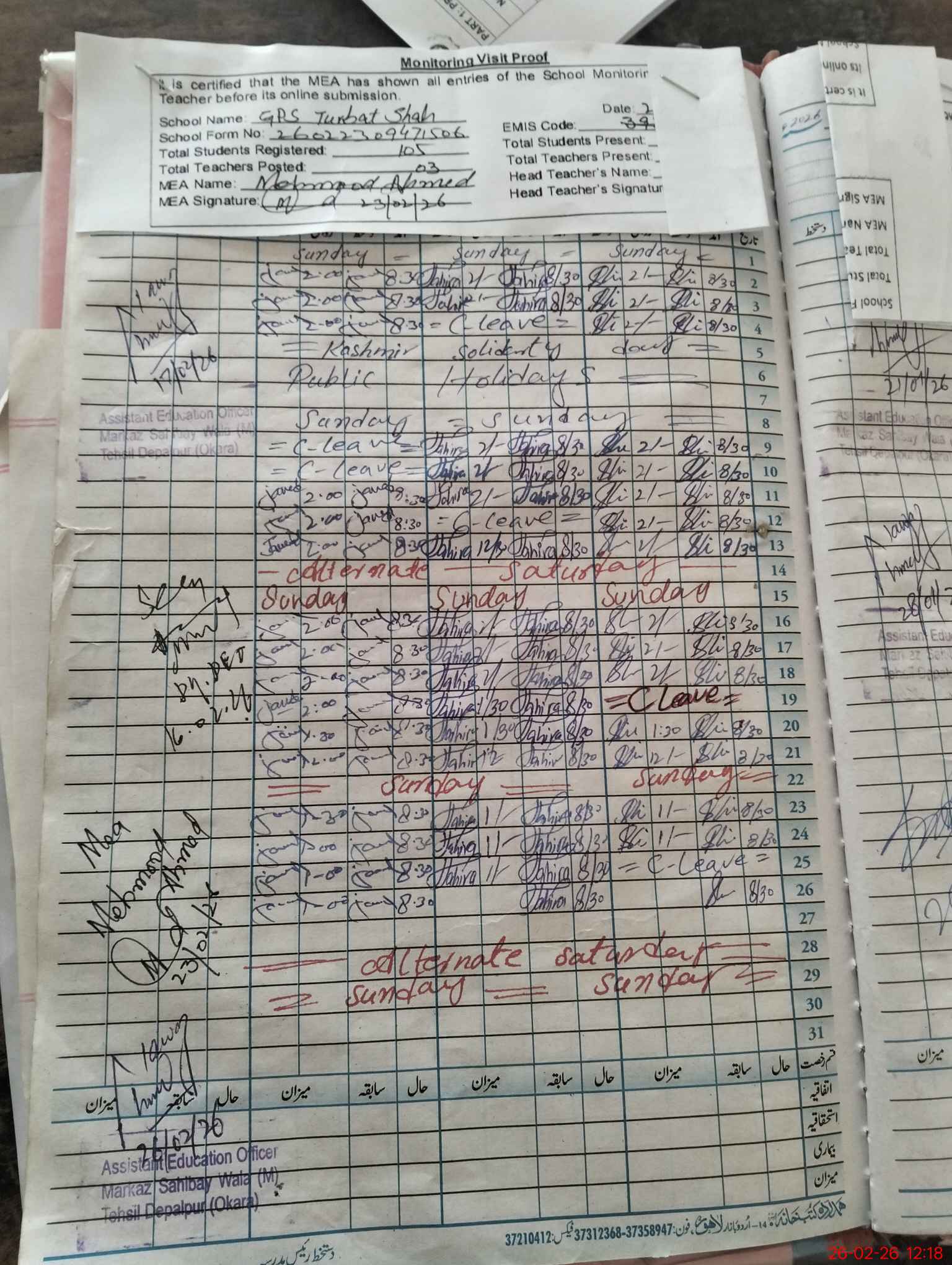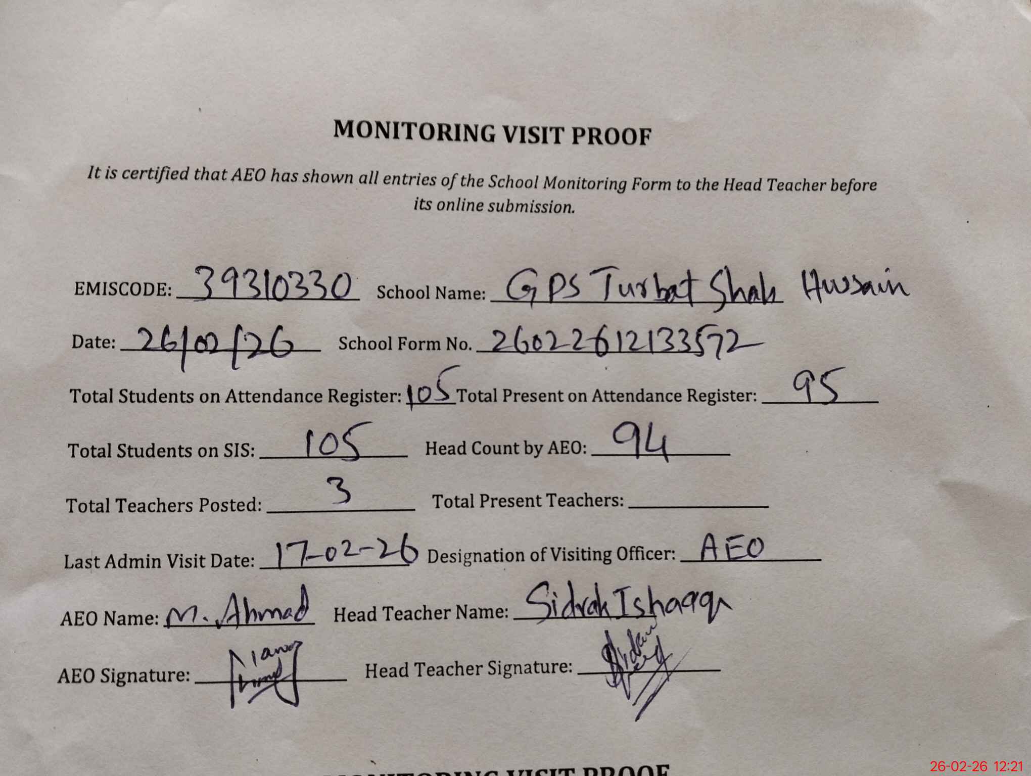 | Monitoring Date: 26-02-2026 | Start Time: 26-02-2026 11:54 AM | End Time: 26-02-2026 12:23 PM | Name of MEA: Mu**** Ah**** | |