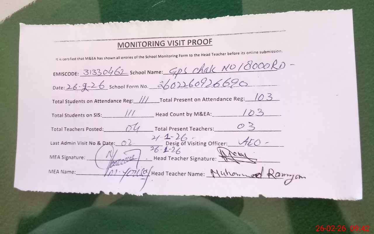 | EMIS Code: 31330462 | Name of School: GPS CHAK NO.18000/RD | |||