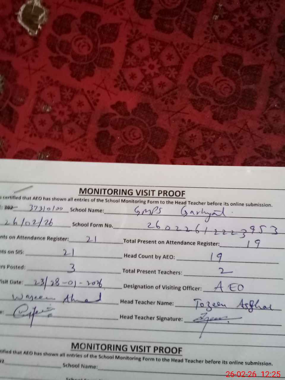 | Attendance Register | Head Teacher | MEA with School | Visit Proof |