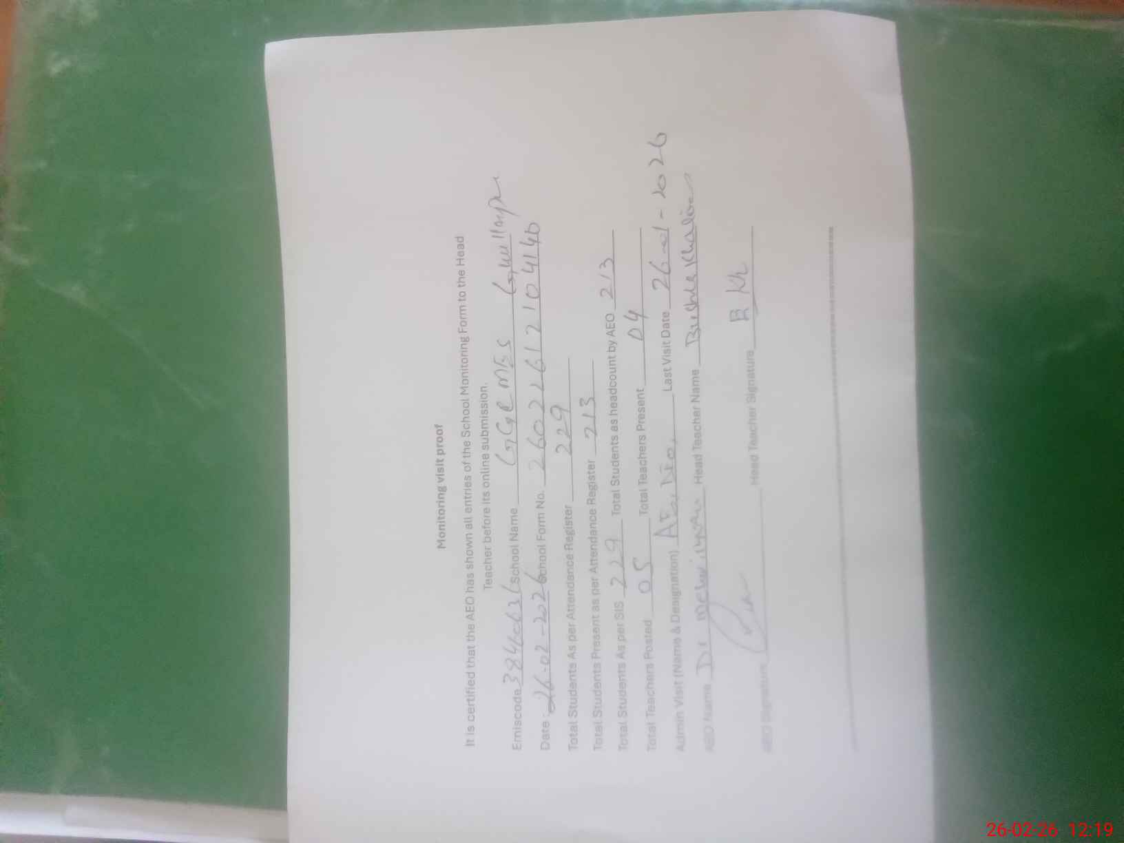 | Attendance Register | Head Teacher | MEA with School | Visit Proof |