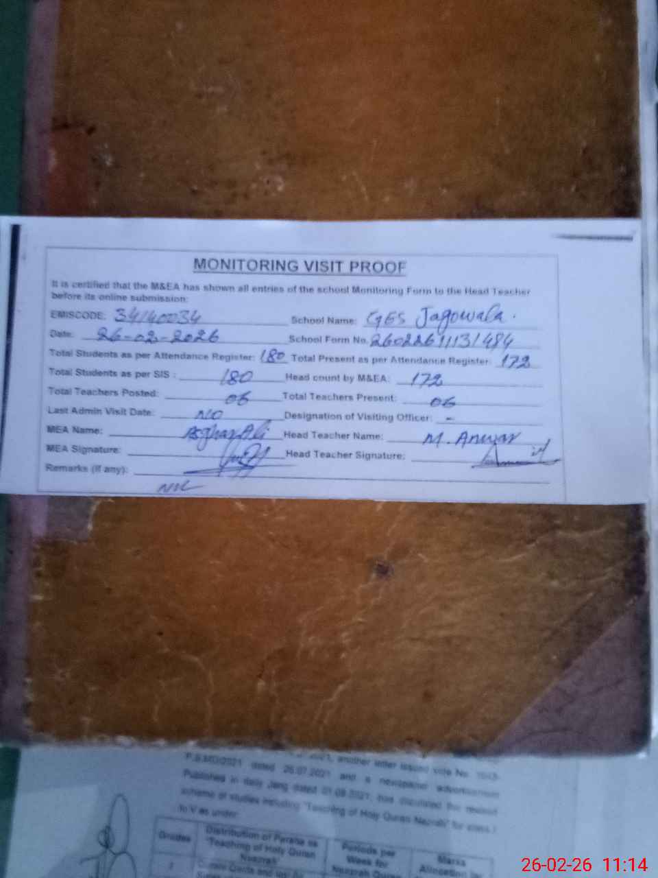 | Attendance Register | Head Teacher | MEA with School | Visit Proof |