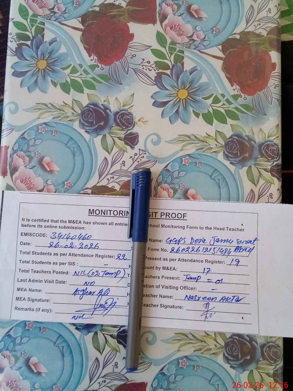| Monitoring Date: 26-02-2026 | Start Time: 26-02-2026 11:51 AM | End Time: 26-02-2026 12:29 PM | Name of MEA: N-**** Al**** | |