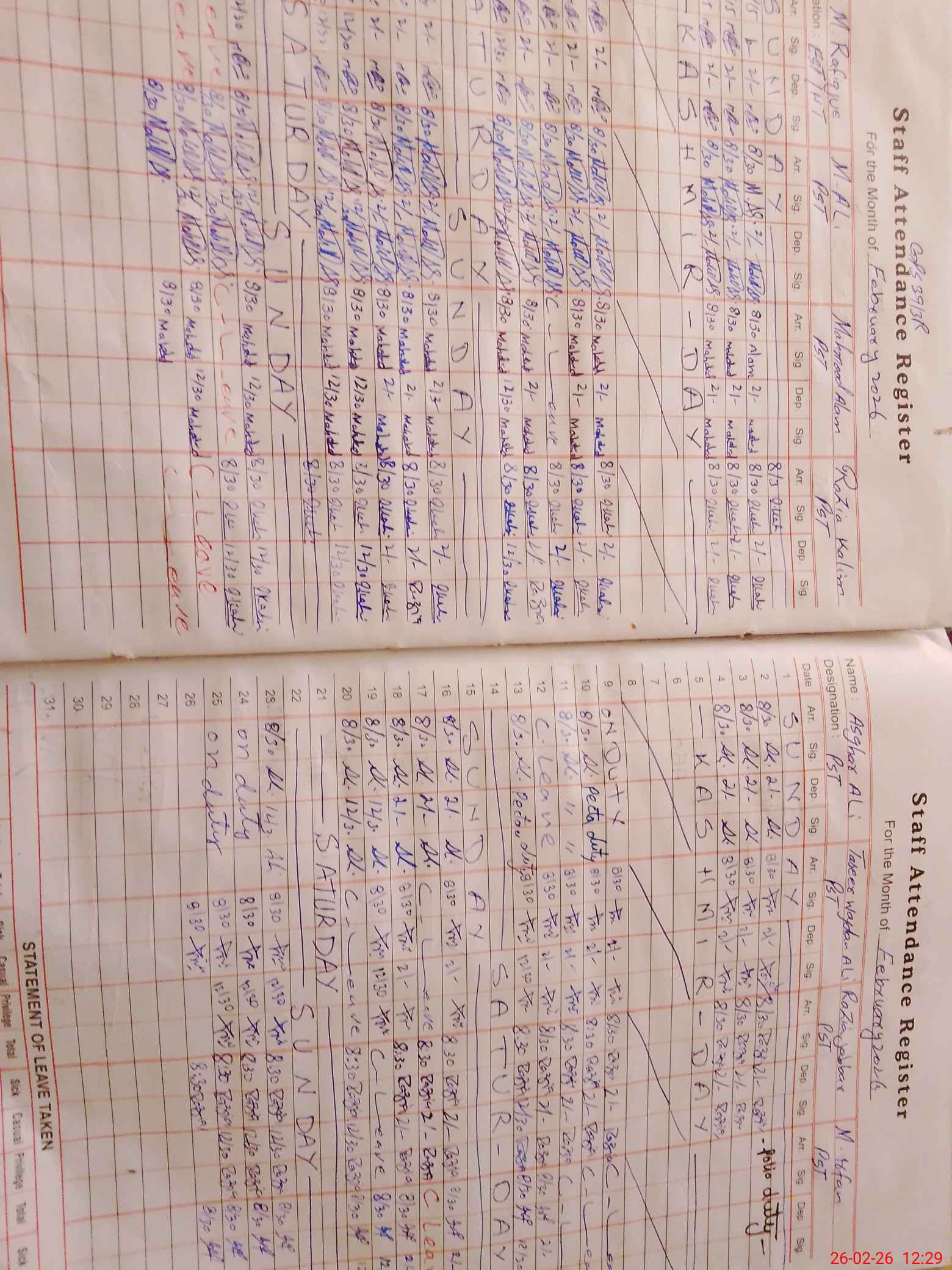 | Leave | Duty | Absent | Maternity | Medical | Ex- Pak |