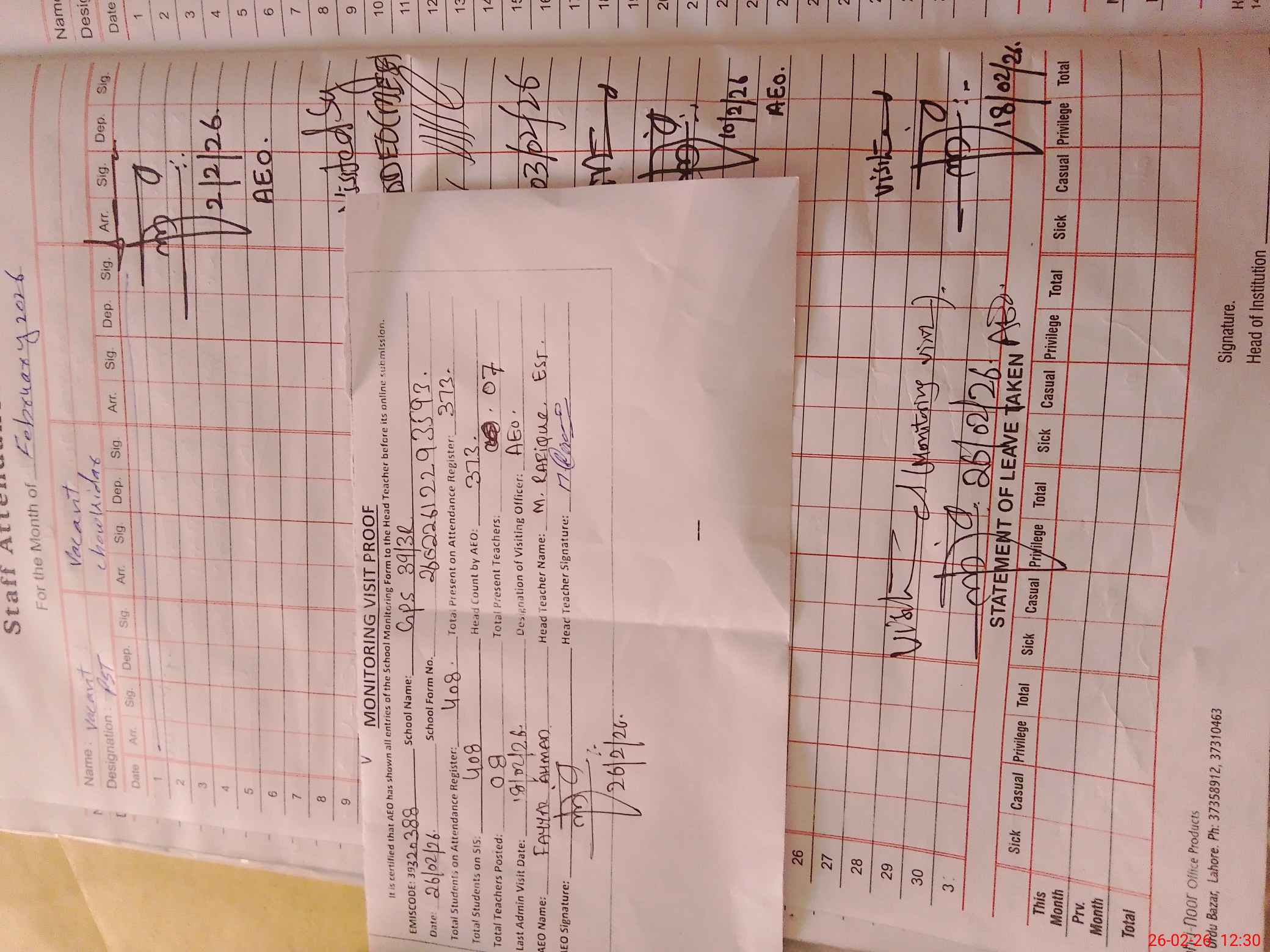 | Attendance Register | Head Teacher | MEA with School | Visit Proof |