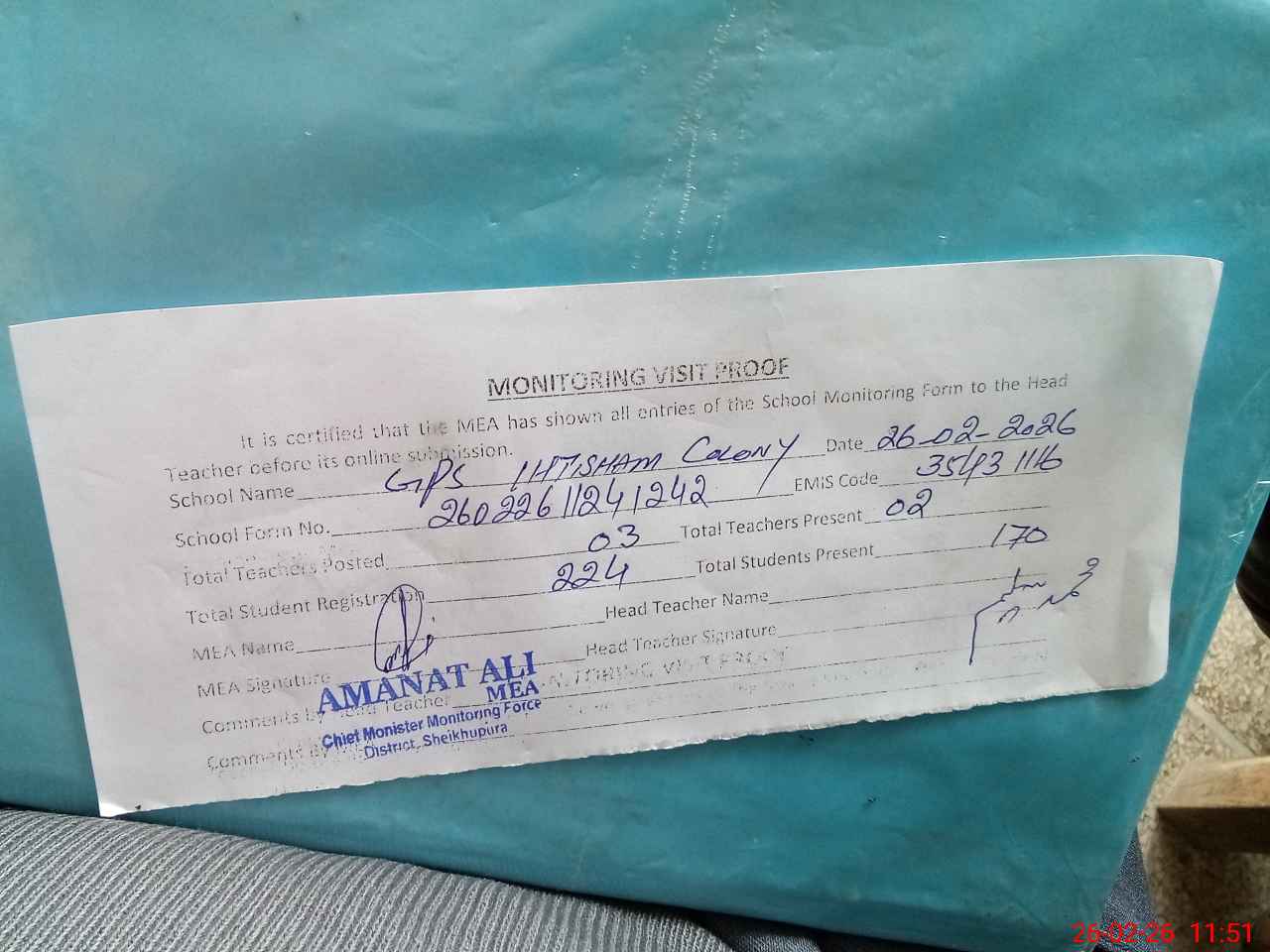| Attendance Register | Head Teacher | MEA with School | Visit Proof |