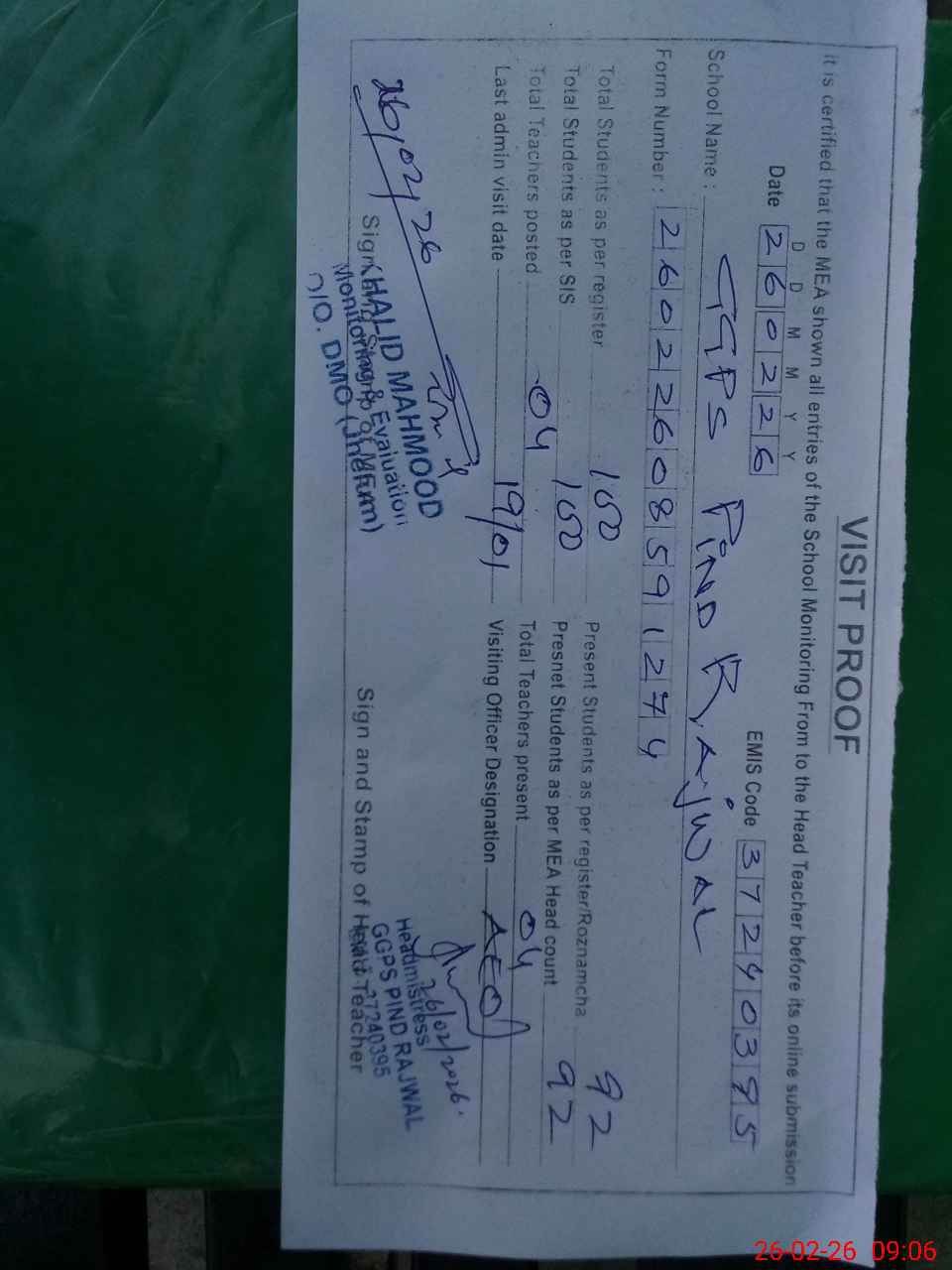 | Certified that this School was Inspected by the Undersigned MEA/DMO Today and the Information Stated Above is as Per Record. | |||||