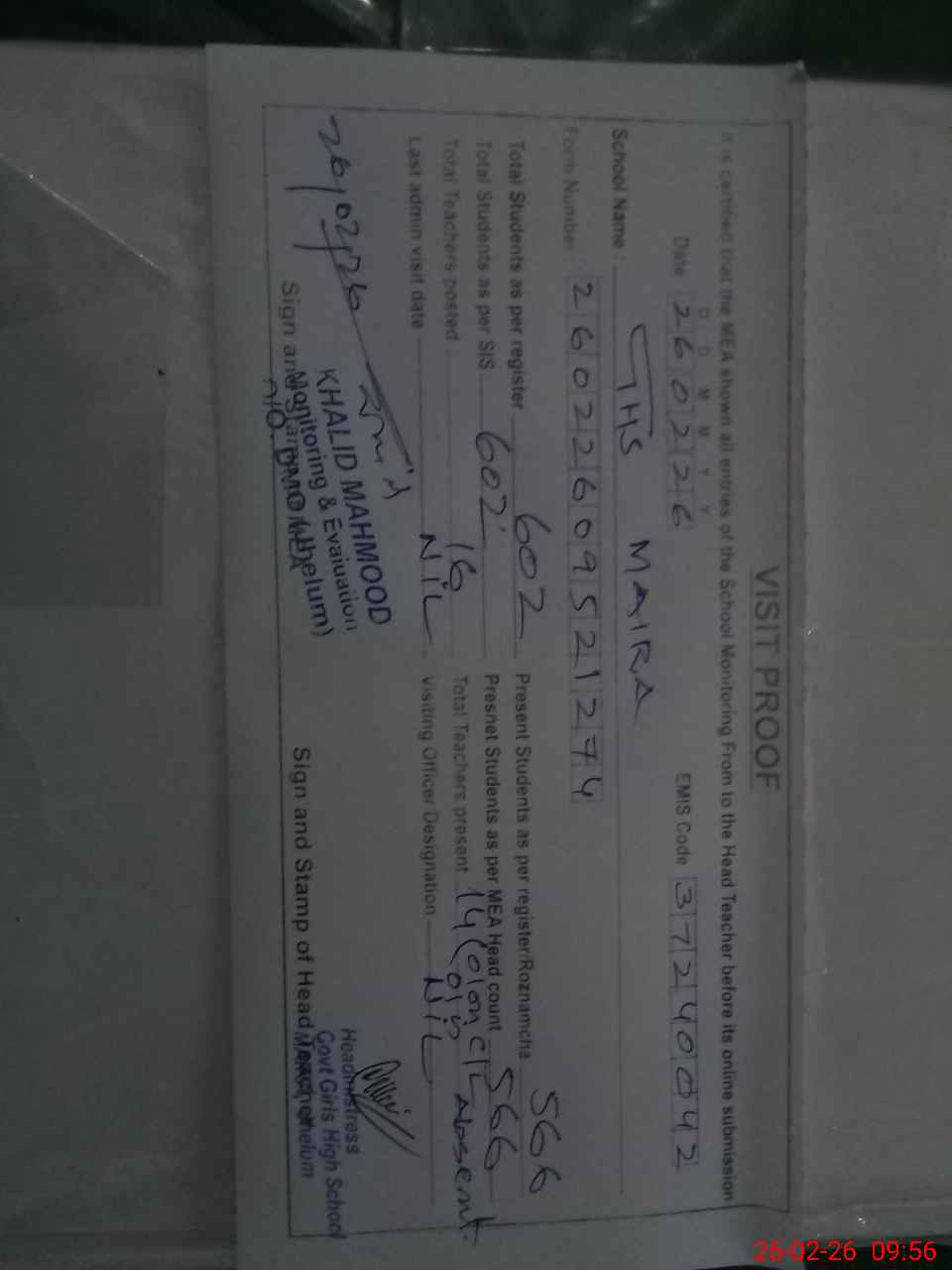 | Certified that this School was Inspected by the Undersigned MEA/DMO Today and the Information Stated Above is as Per Record. | |||||