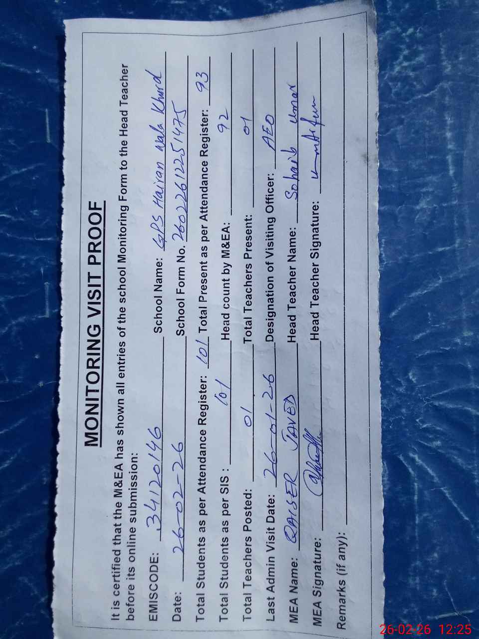 | Attendance Register | Head Teacher | MEA with School | Visit Proof |