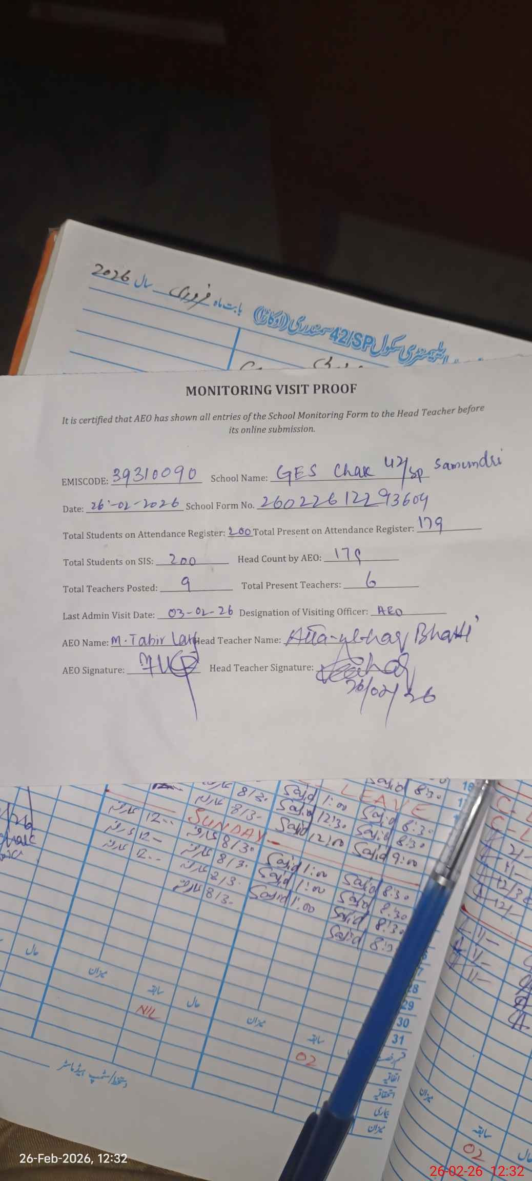 | Attendance Register | Head Teacher | MEA with School | Visit Proof |