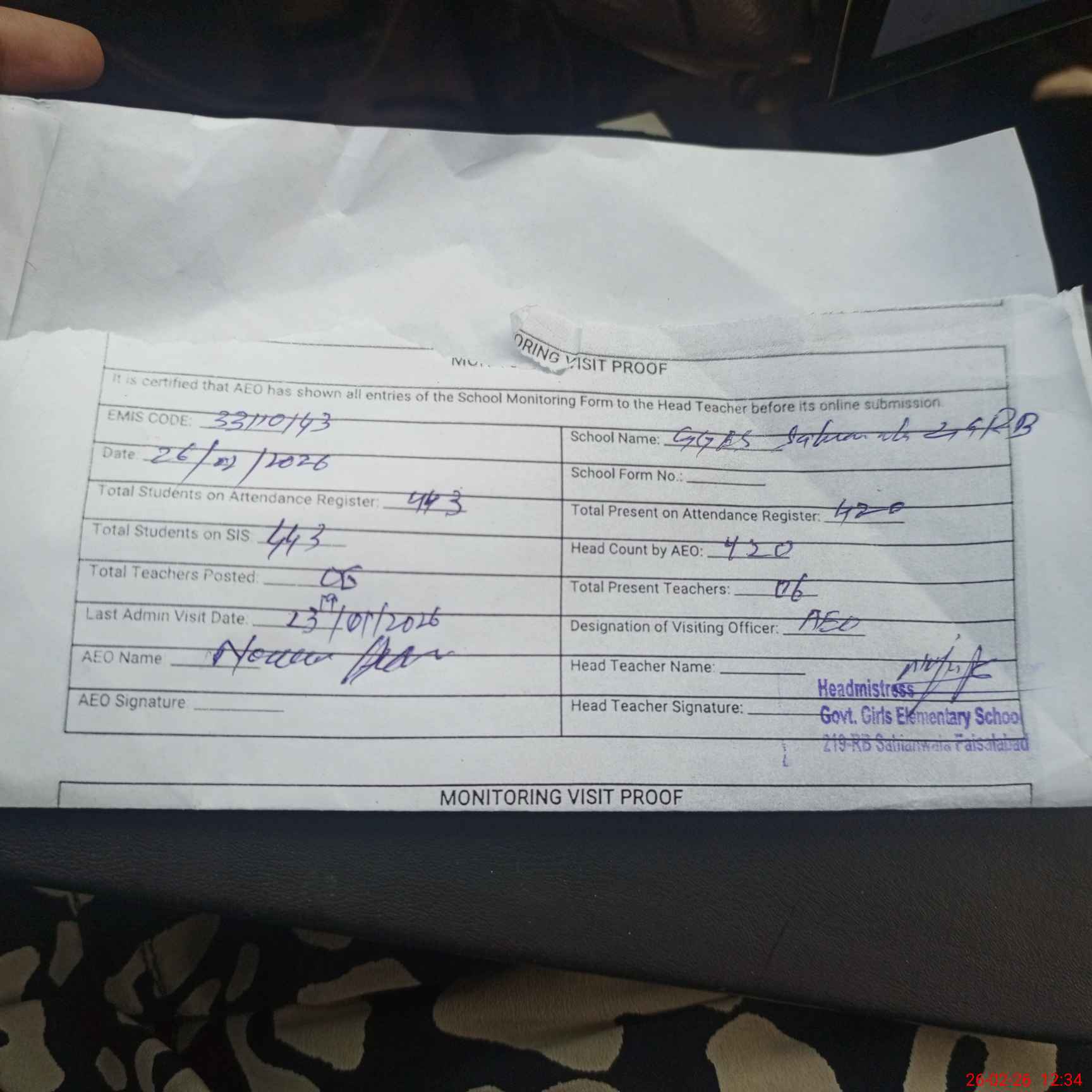| Attendance Register | Head Teacher | MEA with School | Visit Proof |
