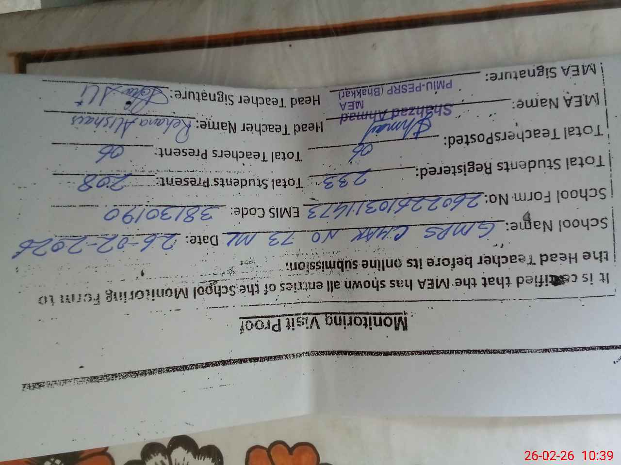 | Certified that this School was Inspected by the Undersigned MEA/DMO Today and the Information Stated Above is as Per Record. | |||||