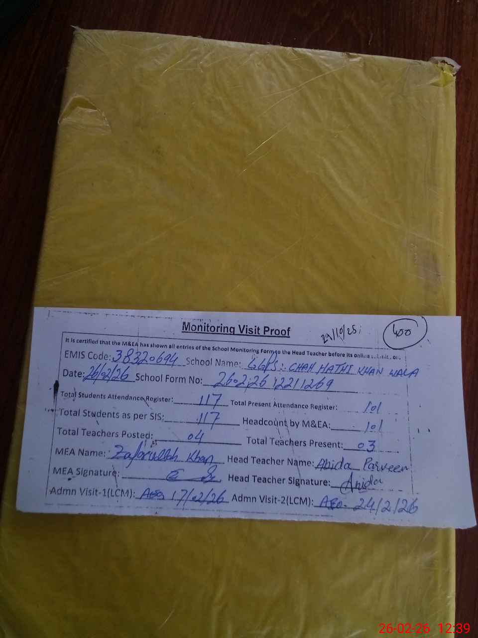 | Attendance Register | Head Teacher | MEA with School | Visit Proof |