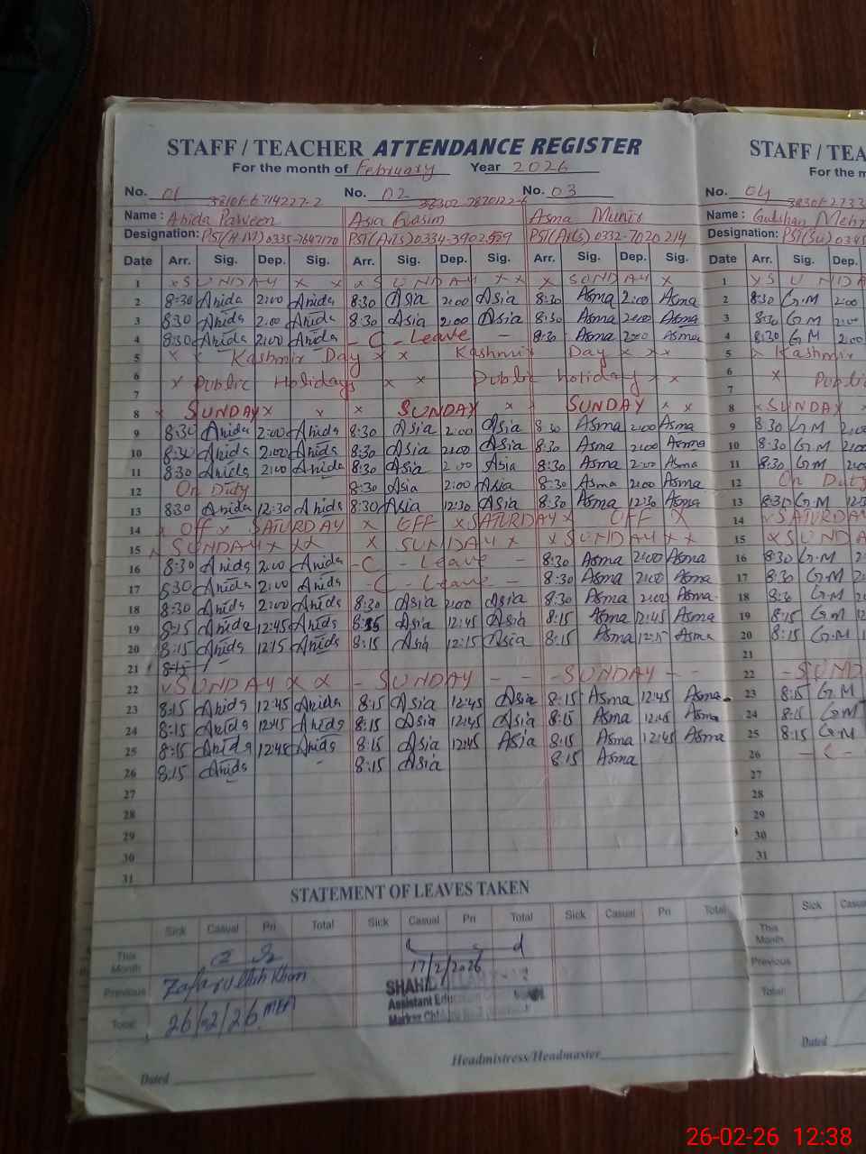 | Leave | Duty | Absent | Maternity | Medical | Ex- Pak |