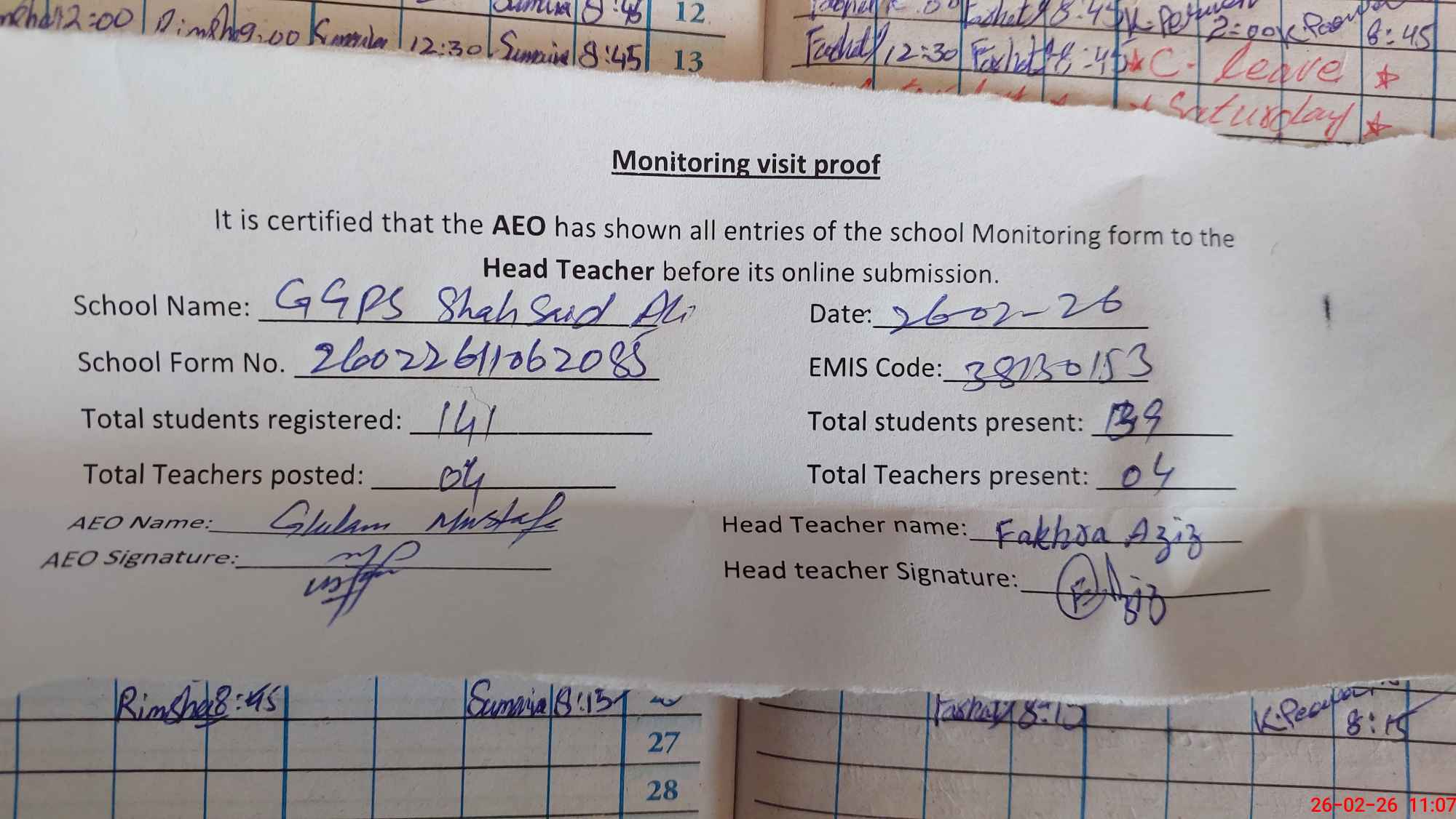 | Attendance Register | Head Teacher | MEA with School | Visit Proof |