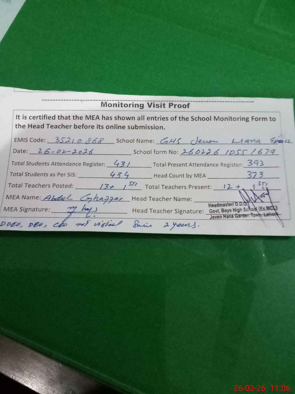 | Certified that this School was Inspected by the Undersigned MEA/DMO Today and the Information Stated Above is as Per Record. | |||||