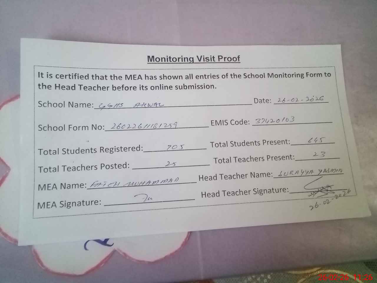 | Attendance Register | Head Teacher | MEA with School | Visit Proof |