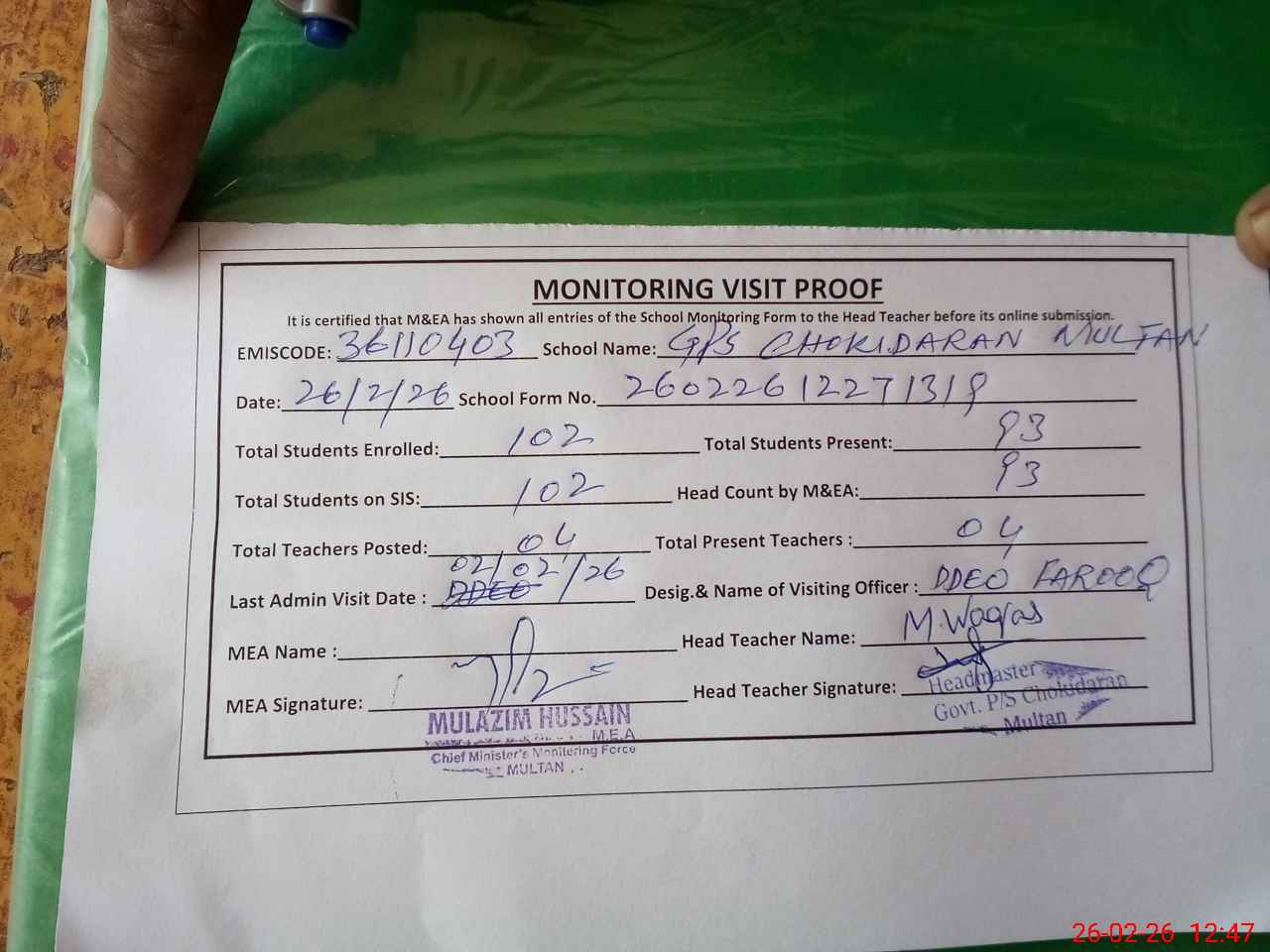 | EMIS Code: 36110403 | Name of School: GPS CHOKIDARAN MOUZA KOTLA MULTAN | |||