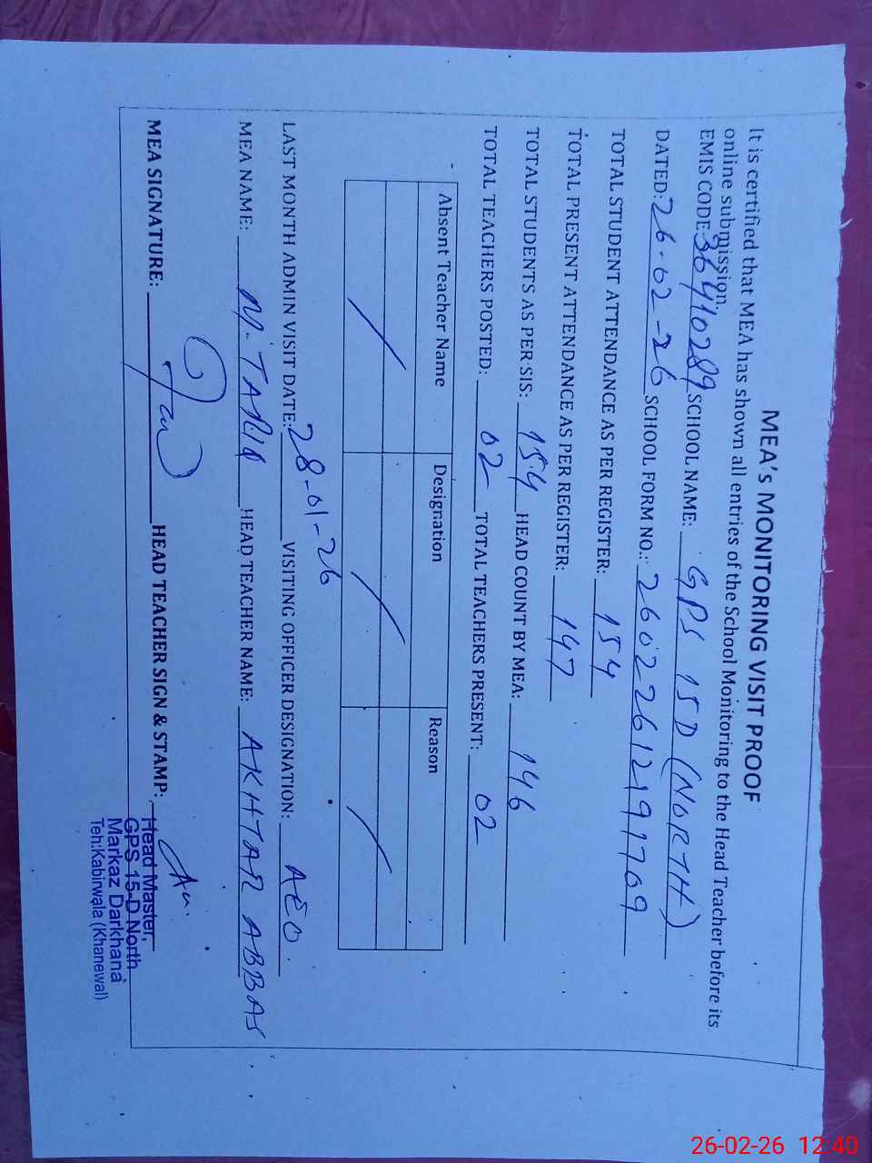 | EMIS Code: 36410289 | Name of School: GPS 15/D NORTH, P/O 25 PUL, ABDUL HAKIM | |||