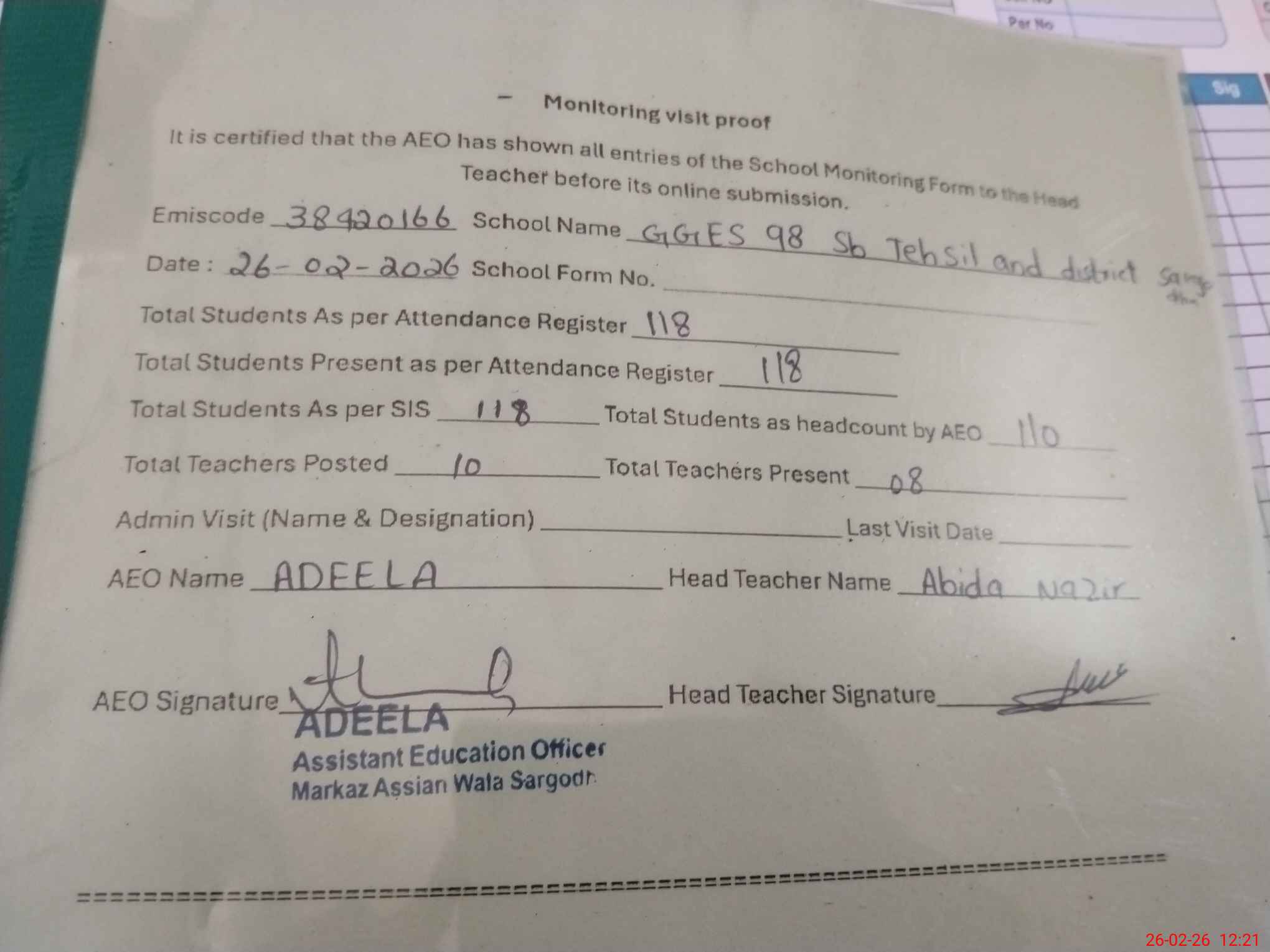 | Monitoring Date: 26-02-2026 | Start Time: 26-02-2026 11:51 AM | End Time: 26-02-2026 12:21 PM | Name of MEA: AD**** | |