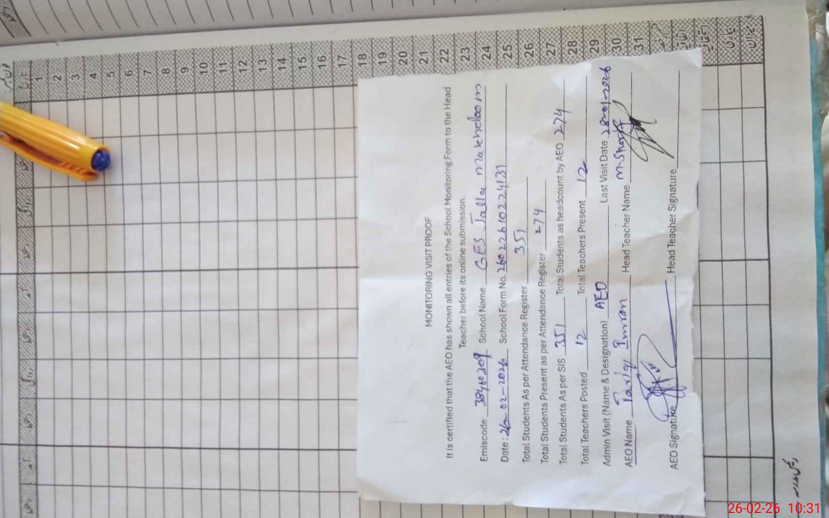 | Attendance Register | Head Teacher | MEA with School | Visit Proof |