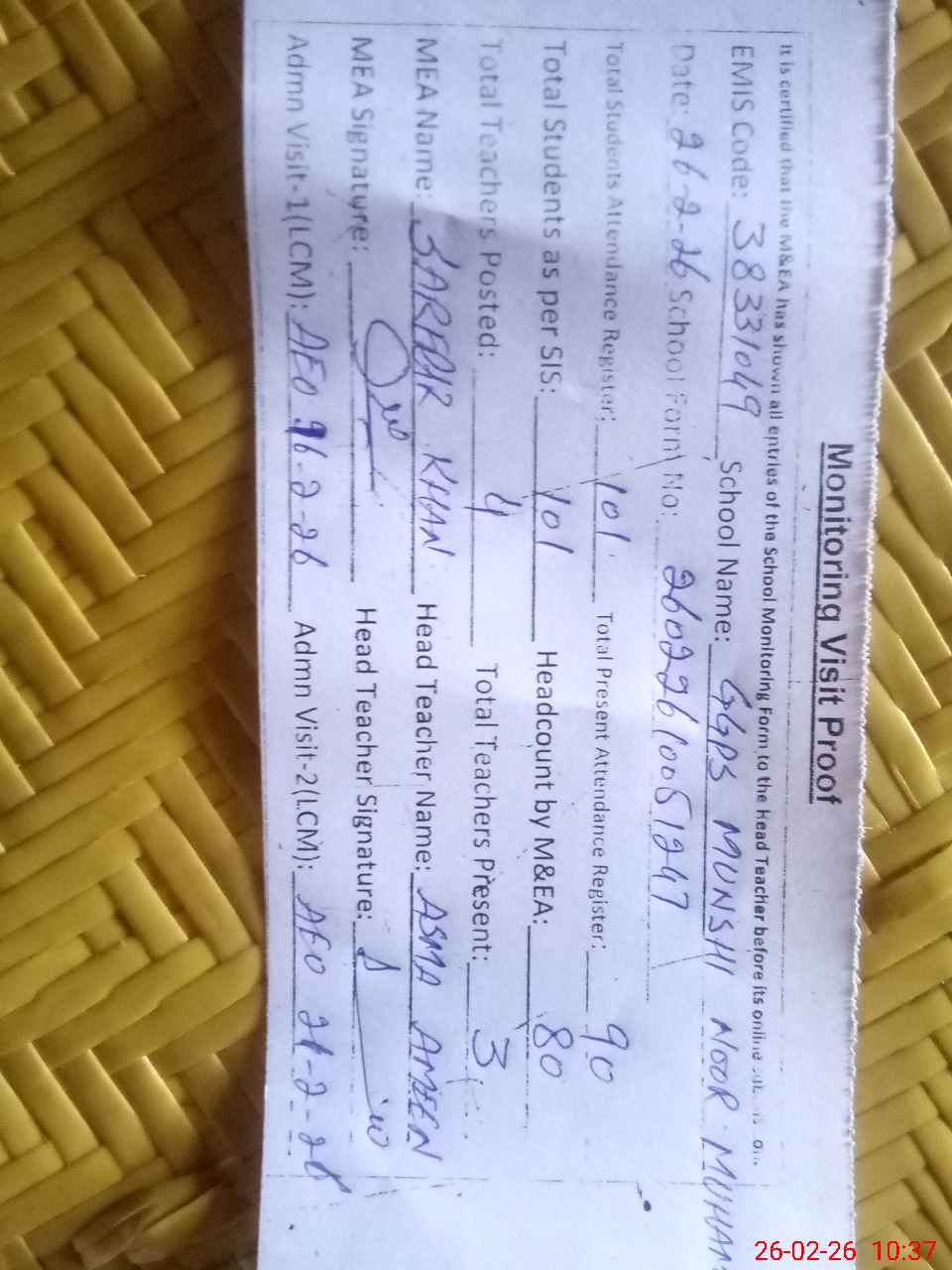 | Attendance Register | Head Teacher | MEA with School | Visit Proof |