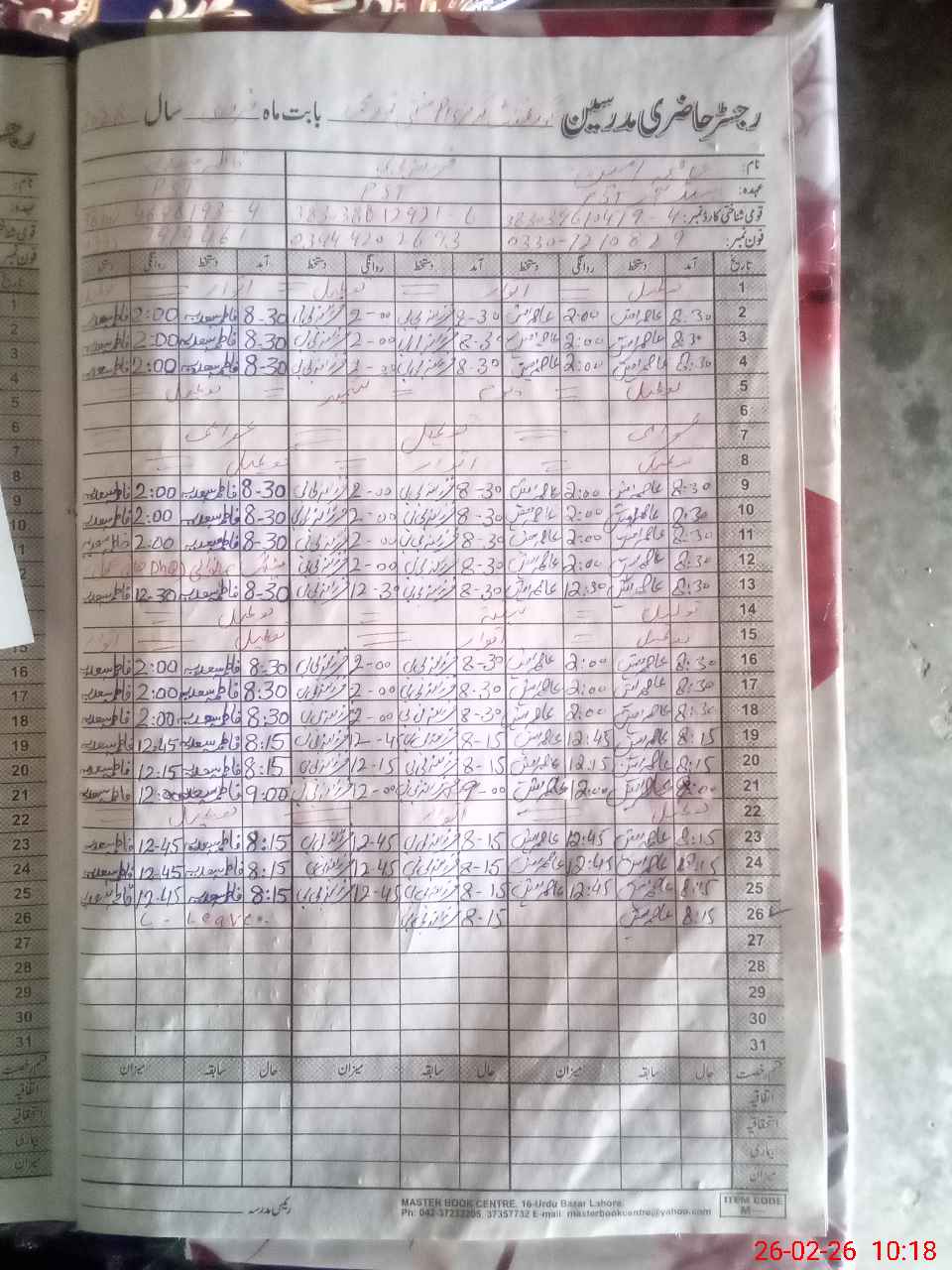 | CNIC | Full Name | Designation | R/C | Absence During Last Calender Month |