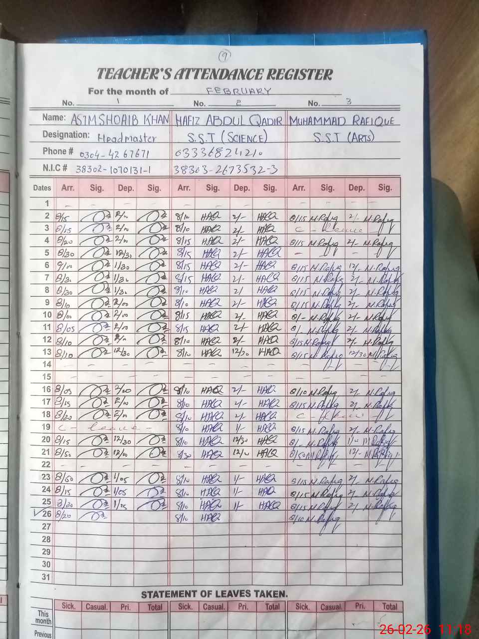 | CNIC | Full Name | Designation | R/C | Absence during last cal. month |