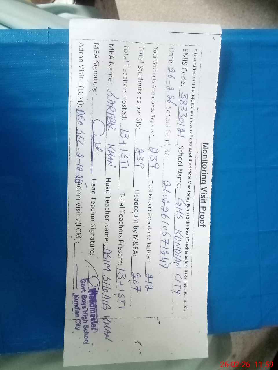| Attendance Register | Head Teacher | MEA with School | Visit Proof |