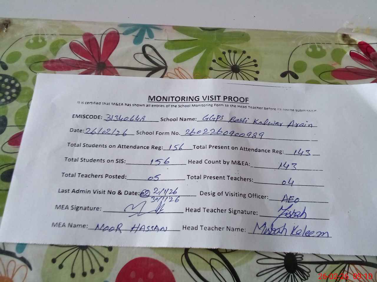 | EMIS Code: 31340648 | Name of School: GGPS KALWARA ARAIN | |||